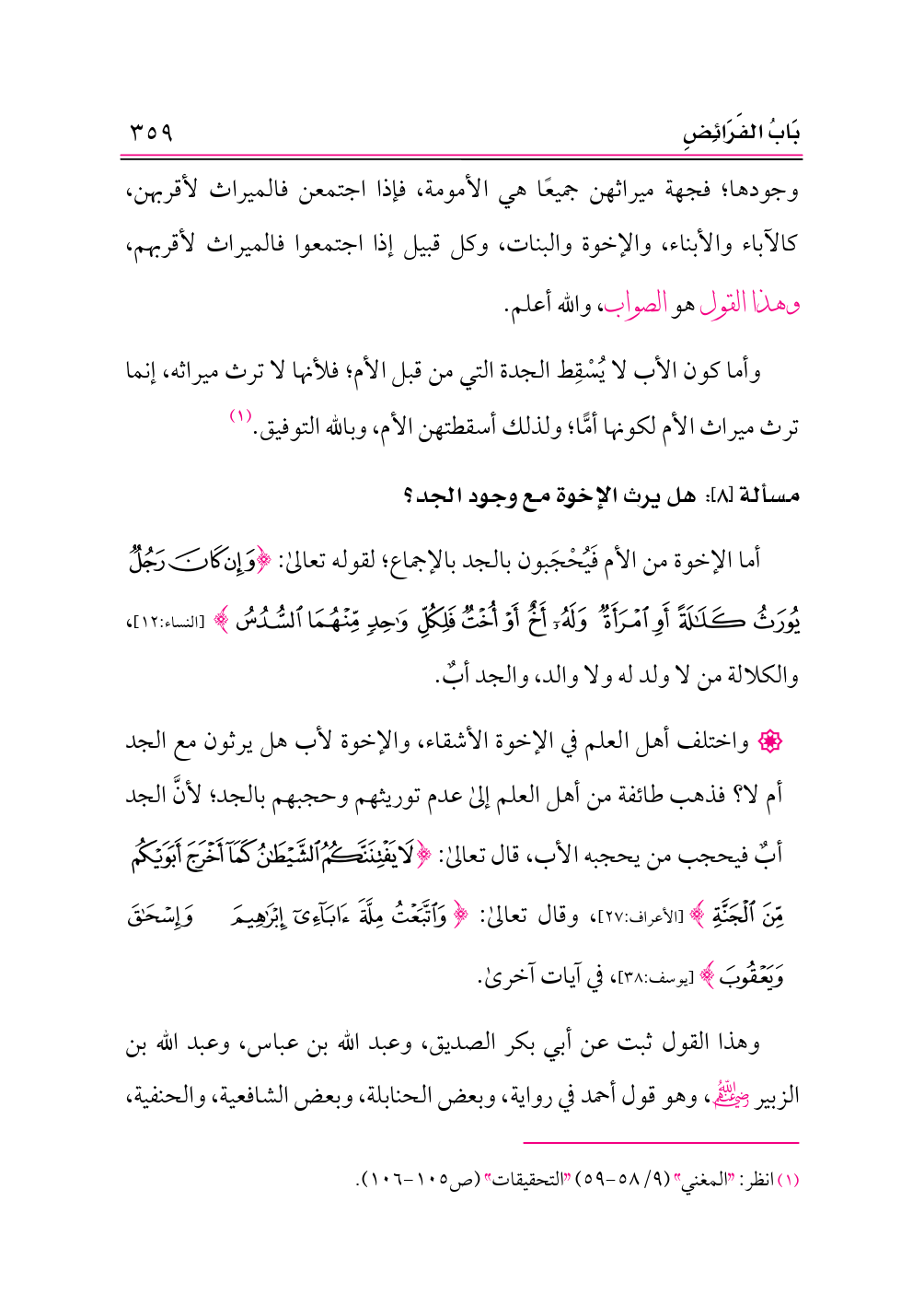 • واختلف أهل العلم في الإخوة الأشقاء، والإخوة لأب هل يرثون مع الجد أم لا؟ فذهب طائفة من أهل العلم إلى عدم توريثهم وحجبهم بالجد؛ لأنَّ الجد أبٌ فيحجب من يحجبه الأب، قال تعالى: {لَا يَفْتِنَنَّكُمُ الشَّيْطَانُ كَمَا أَخْرَجَ أَبَوَيْكُمْ مِنَ الْجَنَّةِ} [الأعراف:٢٧]، وقال تعالى: {وَاتَّبَعْتُ مِلَّةَ آبَائِي إِبْرَاهِيمَ وَإِسْحَاقَ وَيَعْقُوبَ} [يوسف:٣٨]، في آيات آخرى.