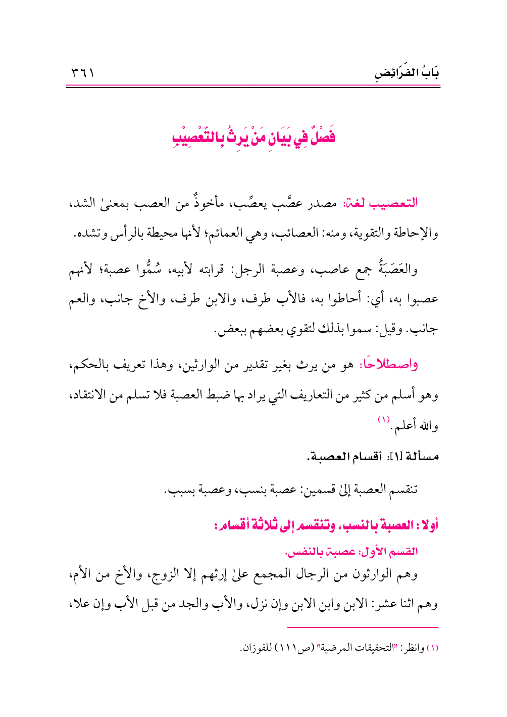 واصطلاحًا: هو من يرث بغير تقدير من الوارثين، وهذا تعريف بالحكم، وهو أسلم من كثير من التعاريف التي يراد بها ضبط العصبة فلا تسلم من الانتقاد، والله أعلم. (¬١)