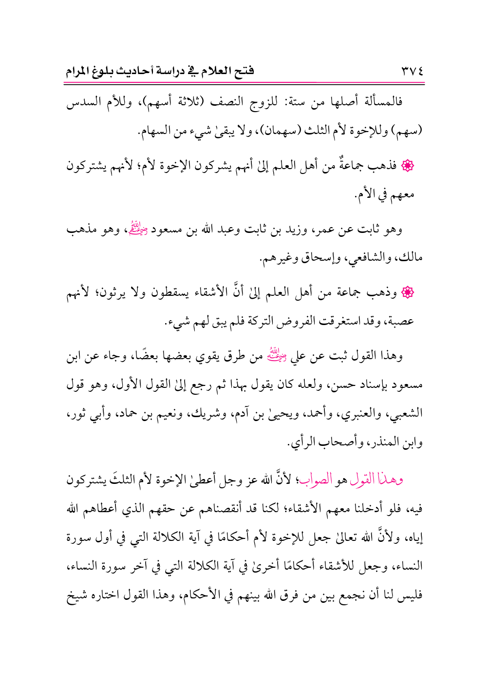 وهذا القول هو الصواب؛ لأنَّ الله عز وجل أعطى الإخوة لأم الثلثَ يشتركون فيه، فلو أدخلنا معهم الأشقاء؛ لكنا قد أنقصناهم عن حقهم الذي أعطاهم الله إياه، ولأنَّ الله تعالى جعل للإخوة لأم أحكامًا في آية الكلالة التي في أول سورة النساء، وجعل للأشقاء أحكامًا أخرى في آية الكلالة التي في آخر سورة النساء، فليس لنا أن نجمع بين من فرق الله بينهم في الأحكام، وهذا القول اختاره شيخ