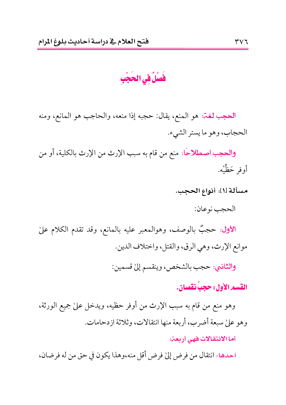 وهو منع من قام به سبب الإرث من أوفر حظيه، ويدخل على جميع الورثة، وهو على سبعة أضرب، أربعة منها انتقالات، وثلاثة ازدحامات.