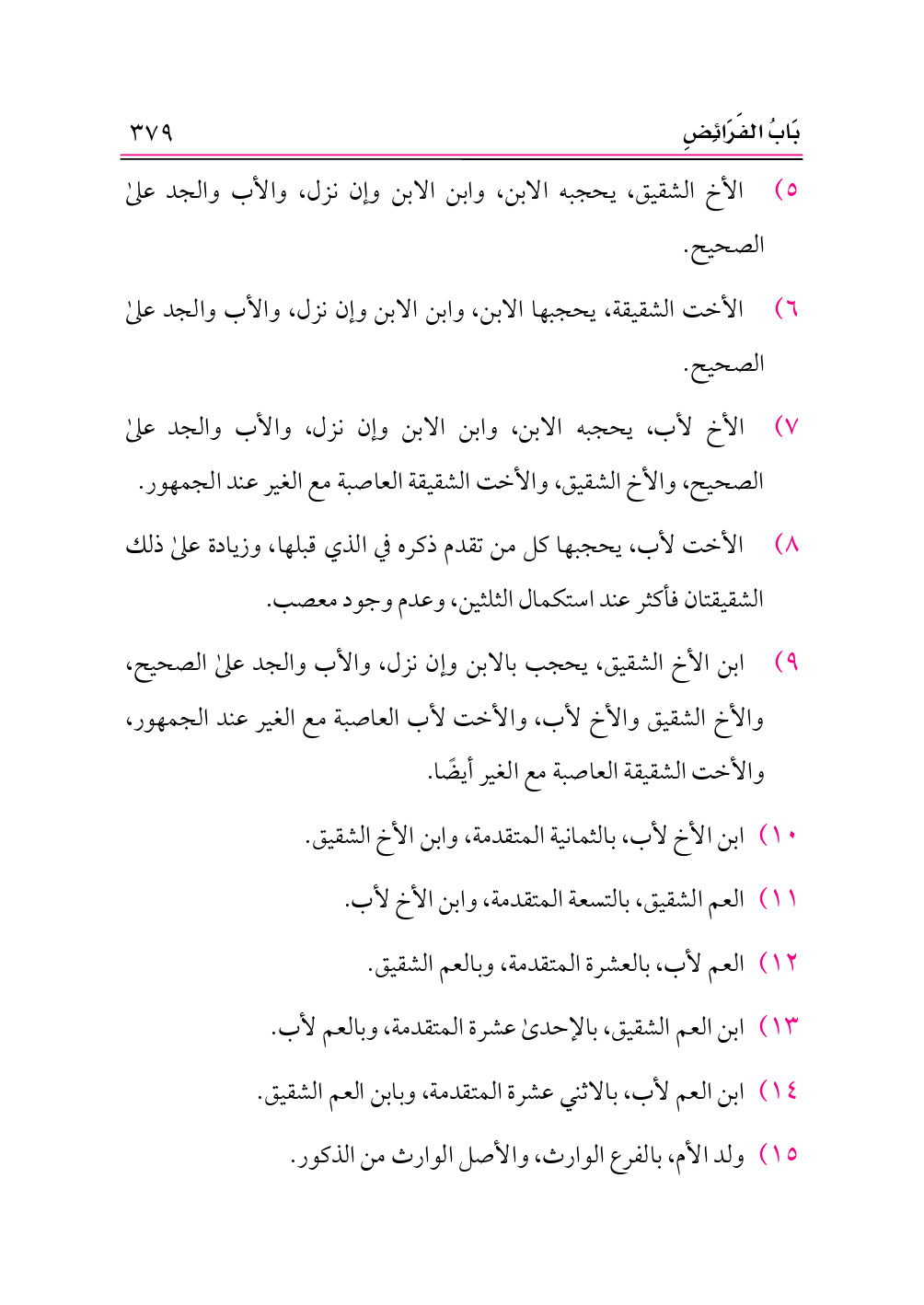 ٥) الأخ الشقيق، يحجبه الابن، وابن الابن وإن نزل، والأب والجد على الصحيح.