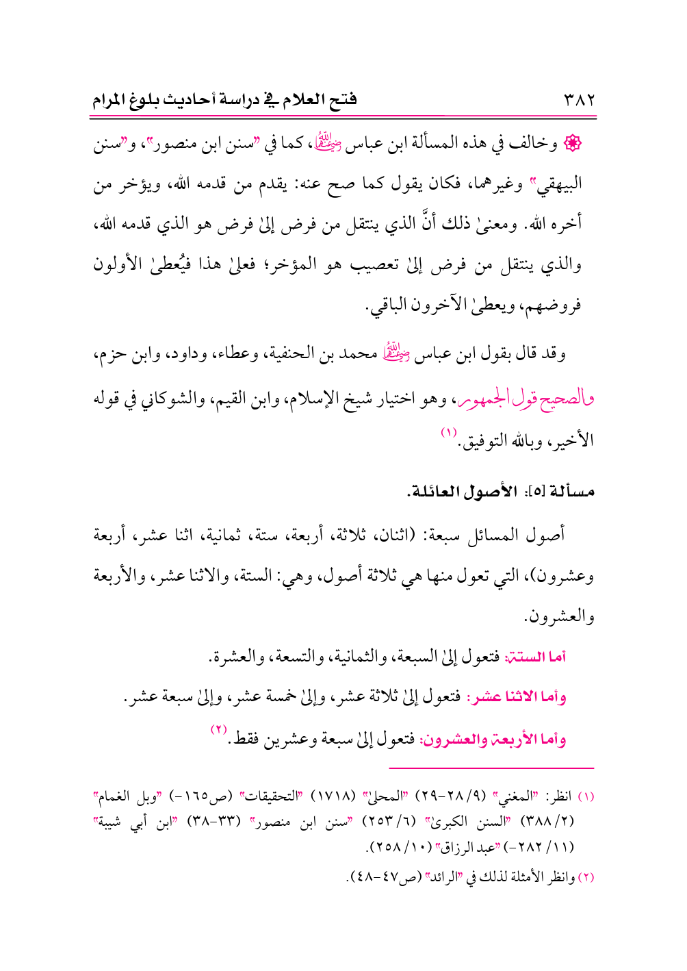 • وخالف في هذه المسألة ابن عباس -رضي الله عنهما-، كما في «سنن ابن منصور»، و «سنن البيهقي» وغيرهما، فكان يقول كما صح عنه: يقدم من قدمه الله، ويؤخر من أخره الله. ومعنى ذلك أنَّ الذي ينتقل من فرض إلى فرض هو الذي قدمه الله، والذي ينتقل من فرض إلى تعصيب هو المؤخر؛ فعلى هذا فيُعطى الأولون فروضهم، ويعطى الآخرون الباقي.