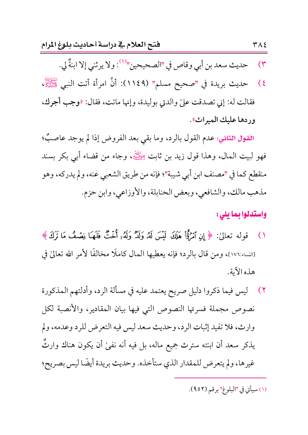 ٢) ليس فيما ذكروا دليل صريح يعتمد عليه في مسألة الرد، وأدلتهم المذكورة نصوص مجملة فسرتها النصوص التي فيها بيان المقادير، والأنصبة لكل وارث، فلا تفيد إثبات الرد، وحديث سعد ليس فيه التعرض للرد وعدمه، ولم يذكر سعد أن ابنته سترث جميع ماله، بل فيه أنه نفى أن يكون هناك وارثٌ غيرها، ولم يتعرض للمقدار الذي ستأخذه. وحديث بريدة أيضًا ليس بصريح؛