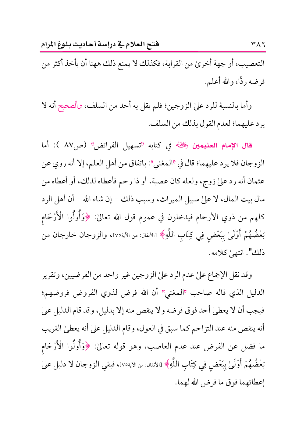 قال الإمام العثيمين -رحمه الله- في كتابه «تسهيل الفرائض» (ص ٨٧ - ): أما الزوجان فلا يرد عليهما؛ قال في «المغني»: باتفاق من أهل العلم، إلا أنه روي عن عثمان أنه رد على زوج، ولعله كان عصبة، أو ذا رحم فأعطاه لذلك، أو أعطاه من مال بيت المال، لا على سبيل الميراث، وسبب ذلك - إن شاء الله - أن أهل الرد كلهم من ذوي الأرحام فيدخلون في عموم قول الله تعالى: {وَأُولُوا الْأَرْحَامِ بَعْضُهُمْ أَوْلَى بِبَعْضٍ فِي كِتَابِ اللَّهِ} [الأنفال: من الآية ٧٥]، والزوجان خارجان من ذلك". انتهى كلامه.