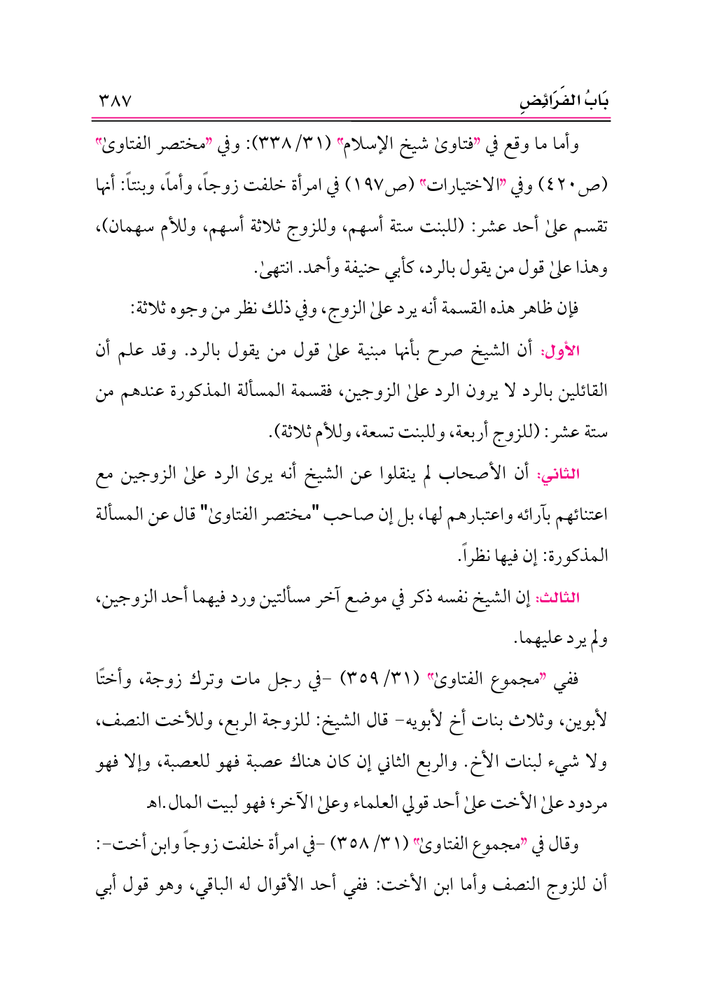الثاني: أن الأصحاب لم ينقلوا عن الشيخ أنه يرى الرد على الزوجين مع اعتنائهم بآرائه واعتبارهم لها، بل إن صاحب "مختصر الفتاوى" قال عن المسألة المذكورة: إن فيها نظراً.