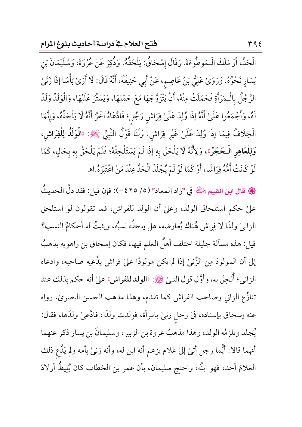 • قال ابن القيم -رحمه الله- في «زاد المعاد» (٥/ ٤٢٥ - ): فإن قيل: فقد دلَّ الحديثُ على حكم استلحاق الولد، وعلى أن الولد للفراش، فما تقولون لو استلحق الزانى ولدًا لا فِراش هُناك يُعارضه، هل يلحقُه نسبُه، ويثبتُ له أحكامُ النسب؟ قيل: هذه مسألة جليلة اختلف أهلُ العلم فيها، فكان إسحاق بن راهويه يذهبُ إلى أن المولودَ مِن الزِّنى إذا لم يكن مولودًا على فراش يدَّعيه صاحبه، وادعاه الزانى؛ أُلحِقَ به، وأوَّل قول النبى - صلى الله عليه وسلم -: «الولد للفراش» على أنه حكم بذلك عند تنازُع الزاني وصاحب الفراش كما تقدم، وهذا مذهب الحسن البصرى، رواه عنه إسحاق بإسناده، فى رجلٍ زنى بامرأة، فولدت ولدًا، فادَّعى ولدَها، فقال: يُجلد ويلزمُه الولد، وهذا مذهبُ عروة بن الزبير، وسليمانَ بن يسار ذكر عنهما أنهما قالا: أيُّما رجل أتى إلى غلام يزعم أنه ابن له، وأنه زنى بأمه ولم يَدَّعِ ذلك الغلامَ أحد، فهو ابنُه، واحتج سليمان، بأن عمر بن الخطاب كان يُلِيطُ أولادَ