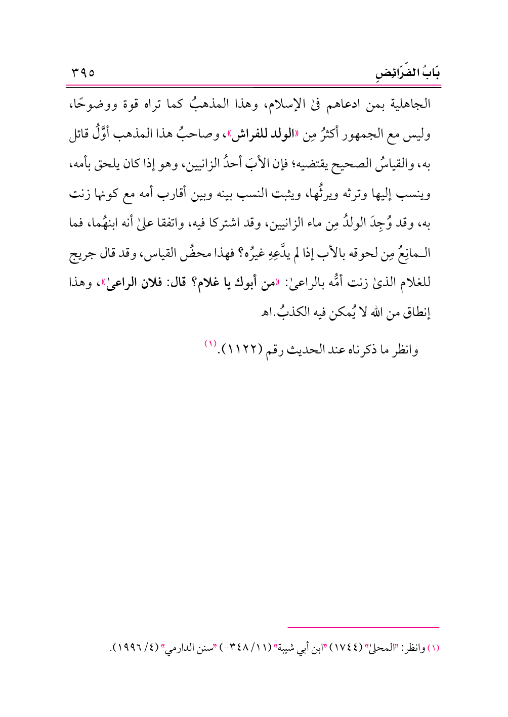 الجاهلية بمن ادعاهم فى الإسلام، وهذا المذهبُ كما تراه قوة ووضوحًا، وليس مع الجمهور أكثرُ مِن «الولد للفراش»، وصاحبُ هذا المذهب أوَّلُ قائل به، والقياسُ الصحيح يقتضيه؛ فإن الأبَ أحدُ الزانيين، وهو إذا كان يلحق بأمه، وينسب إليها وترثه ويرثُها، ويثبت النسب بينه وبين أقارب أمه مع كونها زنت به، وقد وُجِدَ الولدُ مِن ماء الزانيين، وقد اشتركا فيه، واتفقا على أنه ابنهُما، فما المانِعُ مِن لحوقه بالأب إذا لم يدَّعِهِ غيرُه؟ فهذا محضُ القياس، وقد قال جريج للغلام الذى زنت أمُّه بالراعى: «من أبوك يا غلام؟ قال: فلان الراعى»، وهذا إنطاق من الله لا يُمكن فيه الكذبُ. اهـ