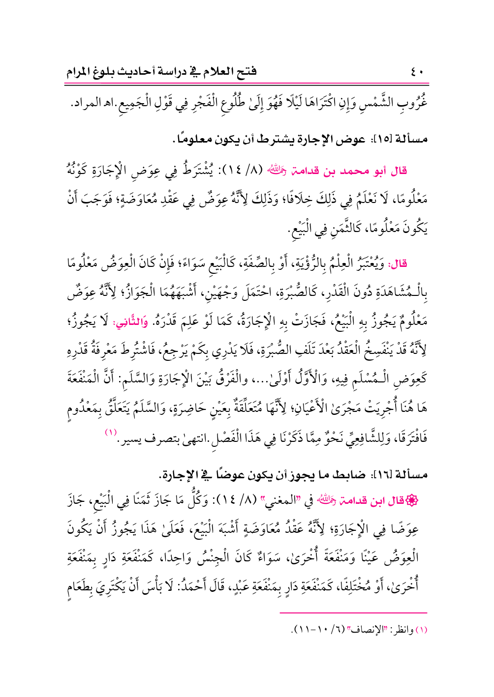 قال: وَيُعْتَبَرُ الْعِلْمُ بِالرُّؤْيَةِ، أَوْ بِالصِّفَةِ، كَالْبَيْعِ سَوَاءً؛ فَإِنْ كَانَ الْعِوَضُ مَعْلُومًا بِالْمُشَاهَدَةِ دُونَ الْقَدْرِ، كَالصُّبْرَةِ، احْتَمَلَ وَجْهَيْنِ، أَشْبَهَهُمَا الْجَوَازُ؛ لِأَنَّهُ عِوَضٌ مَعْلُومٌ يَجُوزُ بِهِ الْبَيْعُ، فَجَازَتْ بِهِ الْإِجَارَةُ، كَمَا لَوْ عَلِمَ قَدْرَهُ. وَالثَّانِي: لَا يَجُوزُ؛ لِأَنَّهُ قَدْ يَنْفَسِخُ الْعَقْدُ بَعْدَ تَلَفِ الصُّبْرَةِ، فَلَا يَدْرِي بِكَمْ يَرْجِعُ، فَاشْتُرِطَ مَعْرِفَةُ قَدْرِهِ كَعِوَضِ الْمُسْلَمِ فِيهِ، وَالْأَوَّلُ أَوْلَى ... ، والْفَرْقُ بَيْنَ الْإِجَارَةِ وَالسَّلَمِ: أَنَّ الْمَنْفَعَةَ هَا هُنَا أُجْرِيَتْ مَجْرَى الْأَعْيَانِ؛ لِأَنَّهَا مُتَعَلِّقَةٌ بِعَيْنٍ حَاضِرَةٍ، وَالسَّلَمُ يَتَعَلَّقُ بِمَعْدُومٍ فَافْتَرَقَا، وَلِلشَّافِعِيِّ نَحْوٌ مِمَّا ذَكَرْنَا فِي هَذَا الْفَصْلِ. انتهى بتصرف يسير. (¬١)