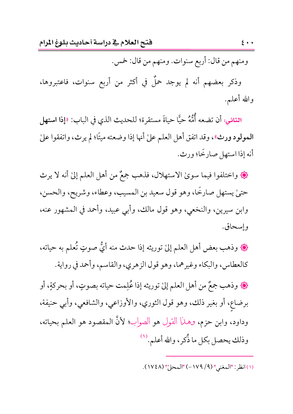 • وذهب جمعٌ من أهل العلم إلى توريثه إذا عُلِمت حياته بصوتٍ، أو بحركةٍ، أو برضاعٍ، أو بغير ذلك، وهو قول الثوري، والأوزاعي، والشافعي، وأبي حنيفة، وداود، وابن حزم، وهذا القول هو الصواب؛ لأنَّ المقصود هو العلم بحياته، وذلك يحصل بكل ما ذُكر، والله أعلم. (¬١)
