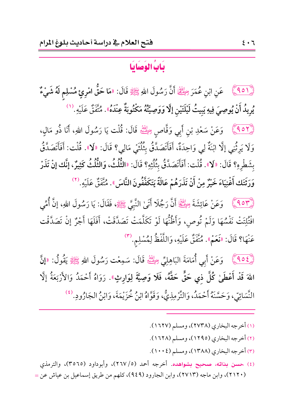٩٥٤ - وَعَنْ أَبِي أُمَامَةَ البَاهِلِيِّ -رضي الله عنه- قَالَ: سَمِعْت رَسُولَ اللهِ - صلى الله عليه وسلم - يَقُولُ: «إنَّ اللهَ قَدْ أَعْطَى كُلَّ ذِي حَقٍّ حَقَّهُ، فَلَا وَصِيَّةَ لِوَارِثٍ». رَوَاهُ أَحْمَدُ وَالأَرْبَعَةُ إلَّا النَّسَائِيّ، وَحَسَّنَهُ أَحْمَدُ، وَالتِّرْمِذِيُّ، وَقَوَّاهُ ابْنُ خُزَيْمَةَ، وَابْنُ الجَارُودِ. (¬٤)
