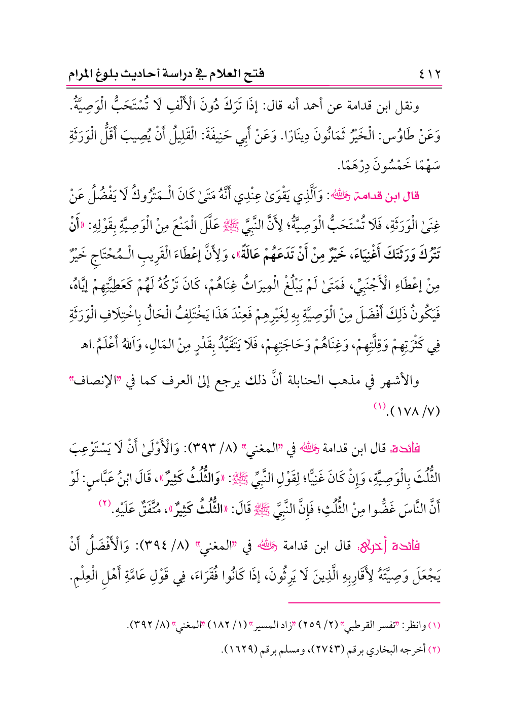 فائدة: قال ابن قدامة -رحمه الله- في «المغني» (٨/ ٣٩٣): وَالْأَوْلَى أَنْ لَا يَسْتَوْعِبَ الثُّلُثَ بِالْوَصِيَّةِ، وَإِنْ كَانَ غَنِيًّا؛ لِقَوْلِ النَّبِيِّ - صلى الله عليه وسلم -: «وَالثُّلُثُ كَثِيرٌ»، قَالَ ابْنُ عَبَّاسٍ: لَوْ أَنَّ النَّاسَ غَضُّوا مِنْ الثُّلُثِ؛ فَإِنَّ النَّبِيَّ - صلى الله عليه وسلم - قَالَ: «الثُّلُثُ كَثِيرٌ»، مُتَّفَقٌ عَلَيْهِ. (¬٢)