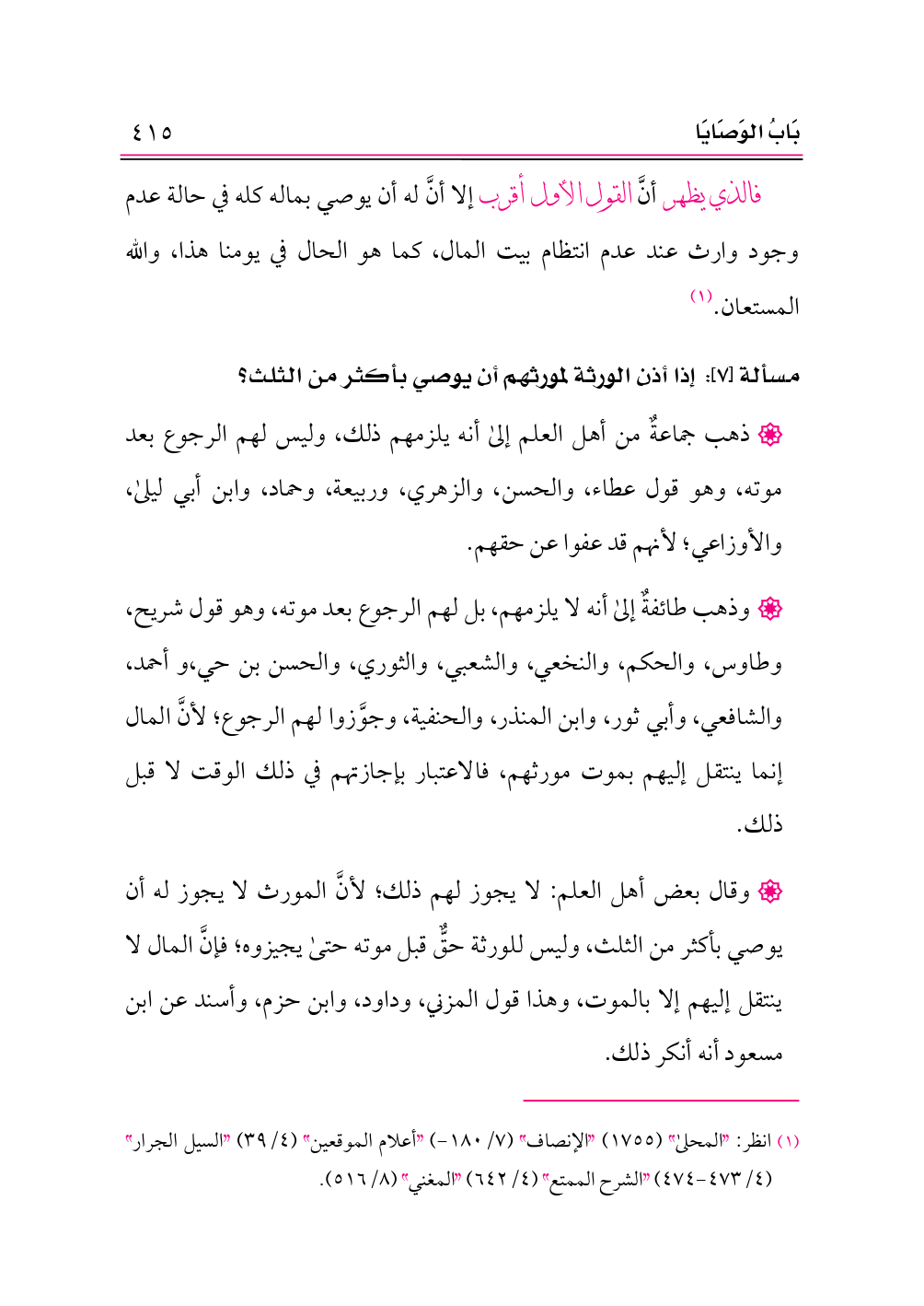 فالذي يظهر أنَّ القول الأول أقرب إلا أنَّ له أن يوصي بماله كله في حالة عدم وجود وارث عند عدم انتظام بيت المال، كما هو الحال في يومنا هذا، والله المستعان. (¬١)