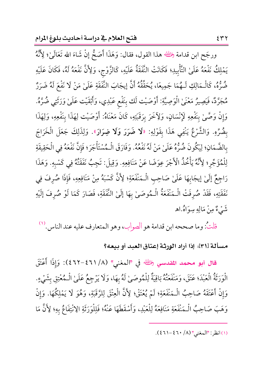 ورجَح ابن قدامة -رحمه الله- هذا القول، فقال: وَهَذَا أَصَحُّ إنْ شَاءَ الله تَعَالَى؛ لِأَنَّهُ يَمْلِكُ نَفْعَهُ عَلَى التَّأْبِيدِ؛ فَكَانَتْ النَّفَقَةُ عَلَيْهِ، كَالزَّوْجِ، وَلِأَنَّ نَفْعَهُ لَهُ، فَكَانَ عَلَيْهِ ضُرُّهُ، كَالْمَالِكِ لَهُمَا جَمِيعًا، يُحَقِّقُهُ أَنَّ إيجَابَ النَّفَقَةِ عَلَى مَنْ لَا نَفْعَ لَهُ ضَرَرٌ مُجَرَّدٌ، فَيَصِيرُ مَعْنَى الْوَصِيَّةِ: أَوْصَيْت لَك بِنَفْعِ عَبْدِي، وَأَبْقَيْت عَلَى وَرَثَتِي ضُرَّهُ. وَإِنْ وَصَّى بِنَفْعِهِ لَإِنْسَانٍ، وَلِآخَرَ بِرَقَبَتِهِ، كَانَ مَعْنَاهُ: أَوْصَيْت لِهَذَا بِنَفْعِهِ، وَلِهَذَا بِضُرِّهِ. وَالشَّرْعُ يَنْفِي هَذَا بِقَوْلِهِ: «لَا ضَرَرَ وَلَا ضِرَارَ». وَلِذَلِكَ جَعَلَ الْخَرَاجَ بِالضَّمَانِ؛ لِيَكُونَ ضُرُّهُ عَلَى مَنْ لَهُ نَفْعُهُ. وَفَارَقَ الْمُسْتَأْجَرَ؛ فَإِنَّ نَفْعَهُ فِي الْحَقِيقَةِ لِلْمُؤَجِّرِ؛ لِأَنَّهُ يَأْخُذُ الْأَجْرَ عِوَضًا عَنْ مَنَافِعِهِ. وَقِيلَ: تَجِبُ نَفَقَتُهُ فِي كَسْبِهِ. وَهَذَا رَاجِعٌ إلَى إيجَابِهَا عَلَى صَاحِبِ الْمَنْفَعَةِ؛ لِأَنَّ كَسْبَهُ مِنْ مَنَافِعِهِ، فَإِذَا صُرِفَ فِي نَفَقَتِهِ، فَقَدْ صُرِفَتْ الْمَنْفَعَةُ الْمُوصَى بِهَا إلَى النَّفَقَةِ، فَصَارَ كَمَا لَوْ صُرِفَ إلَيْهِ شَيْءٌ مِنْ مَالِهِ سِوَاهُ. اهـ