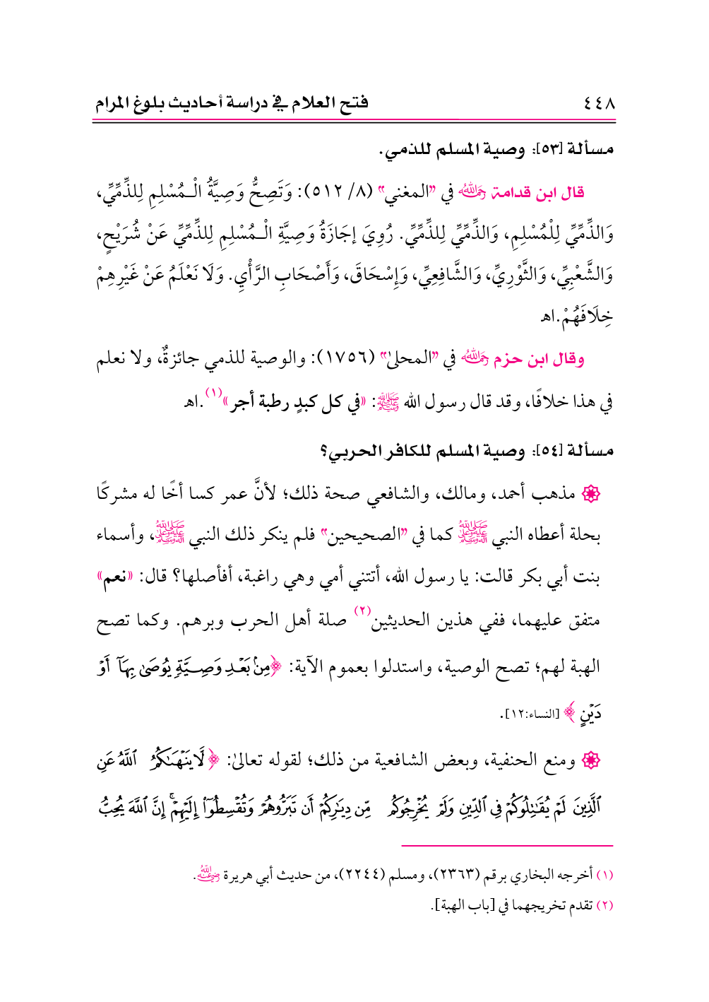 • مذهب أحمد، ومالك، والشافعي صحة ذلك؛ لأنَّ عمر كسا أخًا له مشركًا بحلة أعطاه النبي -صلى الله عليه وعلى آله وسلم- كما في «الصحيحين» فلم ينكر ذلك النبي -صلى الله عليه وعلى آله وسلم-، وأسماء بنت أبي بكر قالت: يا رسول الله، أتتني أمي وهي راغبة، أفأصلها؟ قال: «نعم» متفق عليهما، ففي هذين الحديثين (¬٢) صلة أهل الحرب وبرهم. وكما تصح الهبة لهم؛ تصح الوصية، واستدلوا بعموم الآية: {مِنْ بَعْدِ وَصِيَّةٍ يُوصَى بِهَا أَوْ دَيْنٍ} [النساء:١٢].