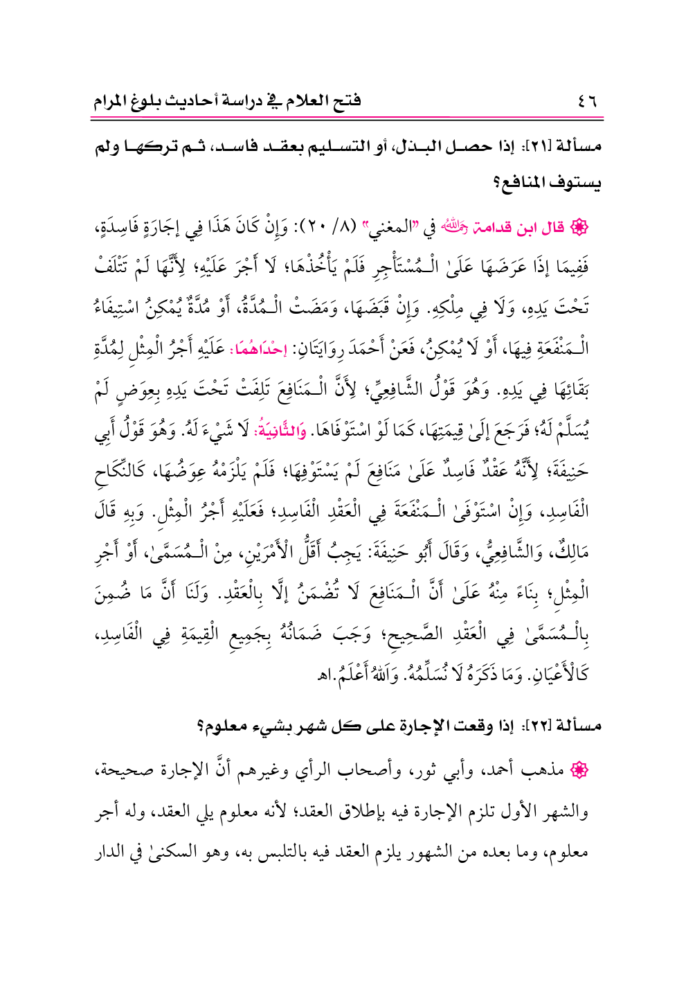 • قال ابن قدامة -رحمه الله- في «المغني» (٨/ ٢٠): وَإِنْ كَانَ هَذَا فِي إجَارَةٍ فَاسِدَةٍ، فَفِيمَا إذَا عَرَضَهَا عَلَى الْمُسْتَأْجِرِ فَلَمْ يَأْخُذْهَا؛ لَا أَجْرَ عَلَيْهِ؛ لِأَنَّهَا لَمْ تَتْلَفْ تَحْتَ يَدِهِ، وَلَا فِي مِلْكِهِ. وَإِنْ قَبَضَهَا، وَمَضَتْ الْمُدَّةُ، أَوْ مُدَّةٌ يُمْكِنُ اسْتِيفَاءُ الْمَنْفَعَةِ فِيهَا، أَوْ لَا يُمْكِنُ، فَعَنْ أَحْمَدَ رِوَايَتَانِ: إحْدَاهُمَا: عَلَيْهِ أَجْرُ الْمِثْلِ لِمُدَّةِ بَقَائِهَا فِي يَدِهِ. وَهُوَ قَوْلُ الشَّافِعِيِّ؛ لِأَنَّ الْمَنَافِعَ تَلِفَتْ تَحْتَ يَدِهِ بِعِوَضٍ لَمْ يُسَلَّمْ لَهُ؛ فَرَجَعَ إلَى قِيمَتِهَا، كَمَا لَوْ اسْتَوْفَاهَا. وَالثَّانِيَةُ: لَا شَيْءَ لَهُ. وَهُوَ قَوْلُ أَبِي حَنِيفَةَ؛ لِأَنَّهُ عَقْدٌ فَاسِدٌ عَلَى مَنَافِعَ لَمْ يَسْتَوْفِهَا؛ فَلَمْ يَلْزَمْهُ عِوَضُهَا، كَالنِّكَاحِ الْفَاسِدِ، وَإِنْ اسْتَوْفَى الْمَنْفَعَةَ فِي الْعَقْدِ الْفَاسِدِ؛ فَعَلَيْهِ أَجْرُ الْمِثْلِ. وَبِهِ قَالَ مَالِكٌ، وَالشَّافِعِيُّ، وَقَالَ أَبُو حَنِيفَةَ: يَجِبُ أَقَلُّ الْأَمْرَيْنِ، مِنْ الْمُسَمَّى، أَوْ أَجْرِ الْمِثْلِ؛ بِنَاءً مِنْهُ عَلَى أَنَّ الْمَنَافِعَ لَا تُضْمَنُ إلَّا بِالْعَقْدِ. وَلَنَا أَنَّ مَا ضُمِنَ بِالْمُسَمَّى فِي الْعَقْدِ الصَّحِيحِ؛ وَجَبَ ضَمَانُهُ بِجَمِيعِ الْقِيمَةِ فِي الْفَاسِدِ، كَالْأَعْيَانِ. وَمَا ذَكَرَهُ لَا نُسَلِّمُهُ. وَاَللهُ أَعْلَمُ. اهـ