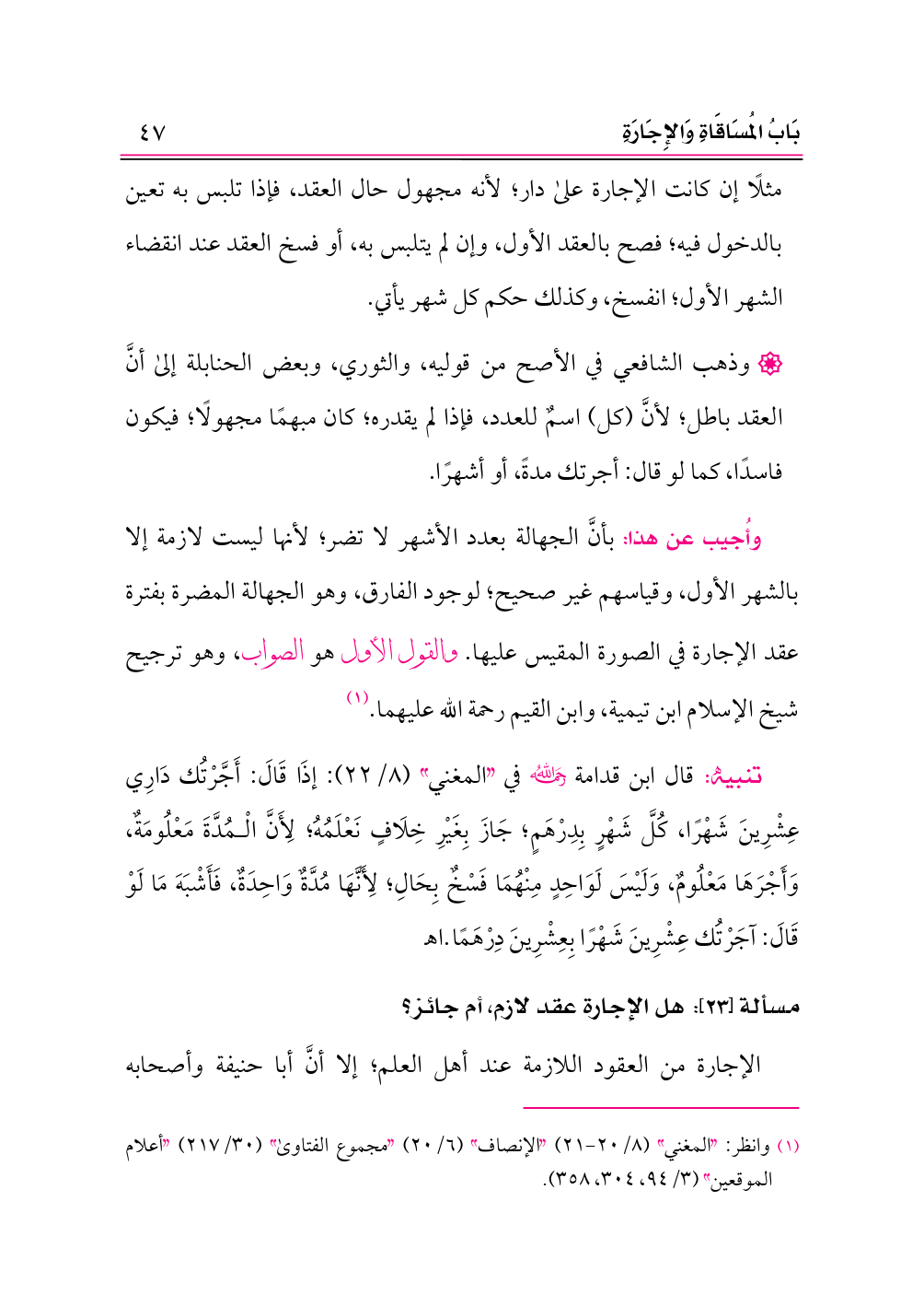 وأُجيب عن هذا: بأنَّ الجهالة بعدد الأشهر لا تضر؛ لأنها ليست لازمة إلا بالشهر الأول، وقياسهم غير صحيح؛ لوجود الفارق، وهو الجهالة المضرة بفترة عقد الإجارة في الصورة المقيس عليها. والقول الأول هو الصواب، وهو ترجيح شيخ الإسلام ابن تيمية، وابن القيم رحمة الله عليهما. (¬١)