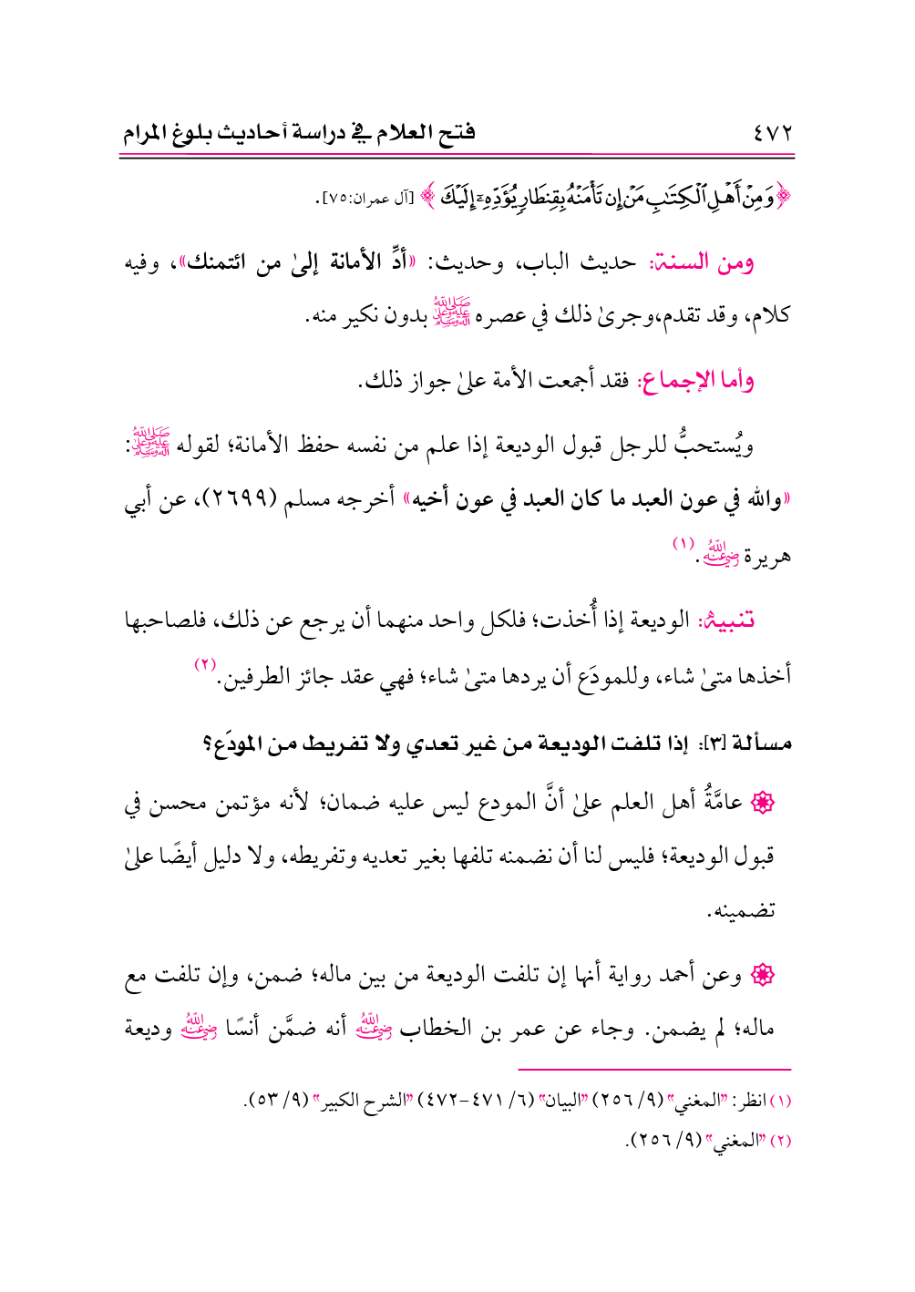 ويُستحبُّ للرجل قبول الوديعة إذا علم من نفسه حفظ الأمانة؛ لقوله -صلى الله عليه وعلى آله وسلم-: «والله في عون العبد ما كان العبد في عون أخيه» أخرجه مسلم (٢٦٩٩)، عن أبي هريرة -رضي الله عنه-. (¬١)
