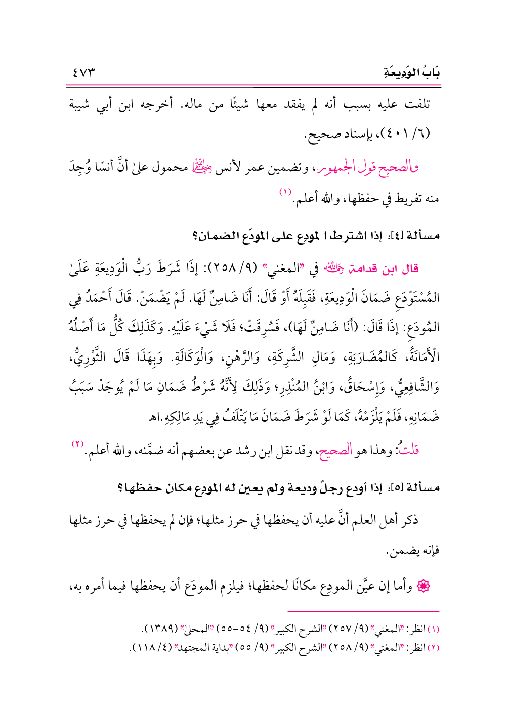 والصحيح قول الجمهور، وتضمين عمر لأنس -رضي الله عنهما- محمول على أنَّ أنسًا وُجِدَ منه تفريط في حفظها، والله أعلم. (¬١)