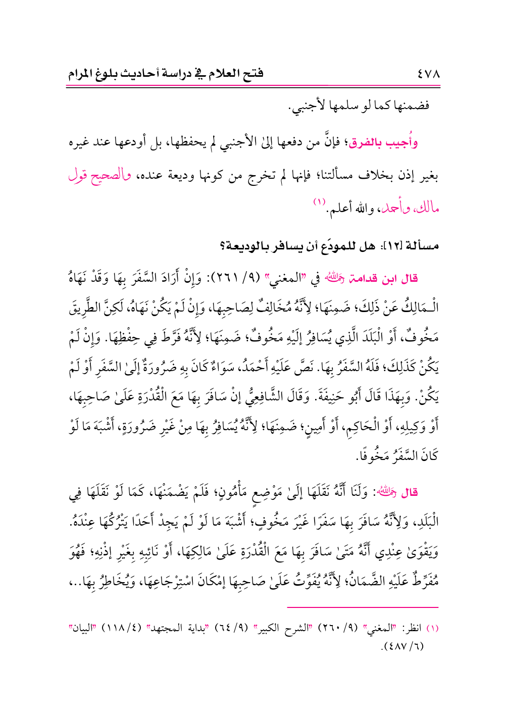 قال ابن قدامة -رحمه الله- في «المغني» (٩/ ٢٦١): وَإِنْ أَرَادَ السَّفَرَ بِهَا وَقَدْ نَهَاهُ الْمَالِكُ عَنْ ذَلِكَ؛ ضَمِنَهَا؛ لِأَنَّهُ مُخَالِفٌ لِصَاحِبِهَا، وَإِنْ لَمْ يَكُنْ نَهَاهُ، لَكِنَّ الطَّرِيقَ مَخُوفٌ، أَوْ الْبَلَدَ الَّذِي يُسَافِرُ إلَيْهِ مَخُوفٌ؛ ضَمِنَهَا؛ لِأَنَّهُ فَرَّطَ فِي حِفْظِهَا. وَإِنْ لَمْ يَكُنْ كَذَلِكَ؛ فَلَهُ السَّفَرُ بِهَا. نَصَّ عَلَيْهِ أَحْمَدُ، سَوَاءٌ كَانَ بِهِ ضَرُورَةٌ إلَى السَّفَرِ أَوْ لَمْ يَكُنْ. وَبِهَذَا قَالَ أَبُو حَنِيفَةَ. وَقَالَ الشَّافِعِيُّ إنْ سَافَرَ بِهَا مَعَ الْقُدْرَةِ عَلَى صَاحِبِهَا، أَوْ وَكِيلِهِ، أَوْ الْحَاكِمِ، أَوْ أَمِينٍ؛ ضَمِنَهَا؛ لِأَنَّهُ يُسَافِرُ بِهَا مِنْ غَيْرِ ضَرُورَةٍ، أَشْبَهَ مَا لَوْ كَانَ السَّفَرُ مَخُوفًا.