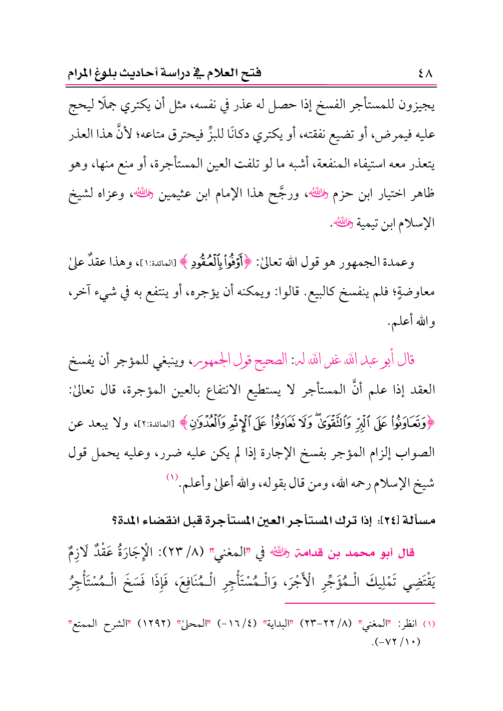 قال أبو عبد الله غفر الله له: الصحيح قول الجمهور، وينبغي للمؤجر أن يفسخ العقد إذا علم أنَّ المستأجر لا يستطيع الانتفاع بالعين المؤجرة، قال تعالى: {وَتَعَاوَنُوا عَلَى الْبِرِّ وَالتَّقْوَى وَلَا تَعَاوَنُوا عَلَى الْإِثْمِ وَالْعُدْوَانِ} [المائدة:٢]، ولا يبعد عن الصواب إلزام المؤجر بفسخ الإجارة إذا لم يكن عليه ضرر، وعليه يحمل قول شيخ الإسلام رحمه الله، ومن قال بقوله، والله أعلى وأعلم. (¬١)