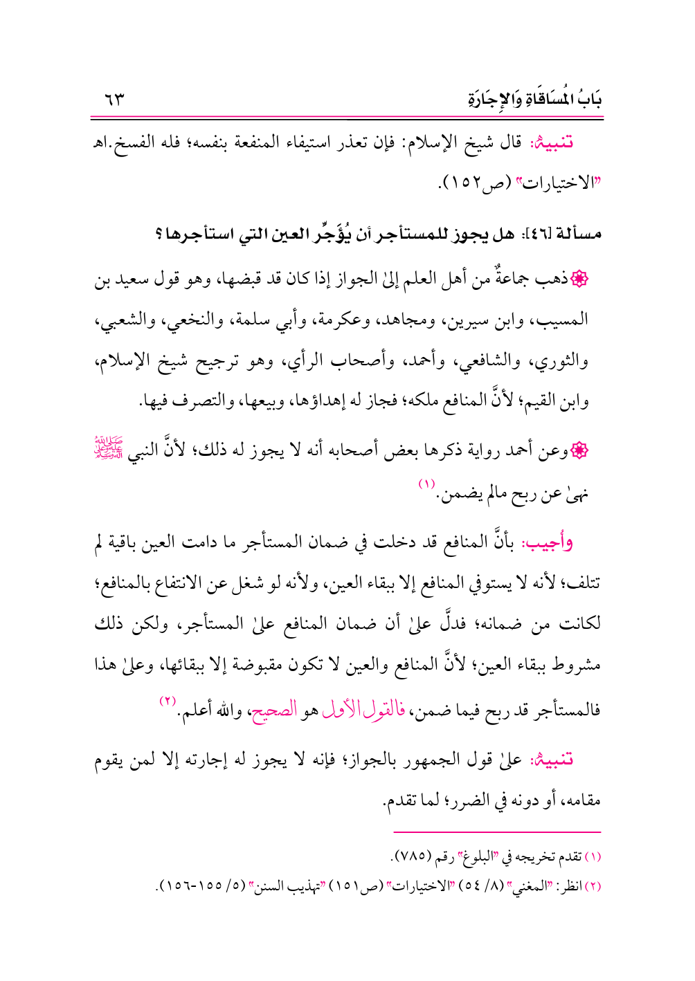 وأُجيب: بأنَّ المنافع قد دخلت في ضمان المستأجر ما دامت العين باقية لم تتلف؛ لأنه لا يستوفي المنافع إلا ببقاء العين، ولأنه لو شغل عن الانتفاع بالمنافع؛ لكانت من ضمانه؛ فدلَّ على أن ضمان المنافع على المستأجر، ولكن ذلك مشروط ببقاء العين؛ لأنَّ المنافع والعين لا تكون مقبوضة إلا ببقائها، وعلى هذا فالمستأجر قد ربح فيما ضمن، فالقول الأول هو الصحيح، والله أعلم. (¬٢)