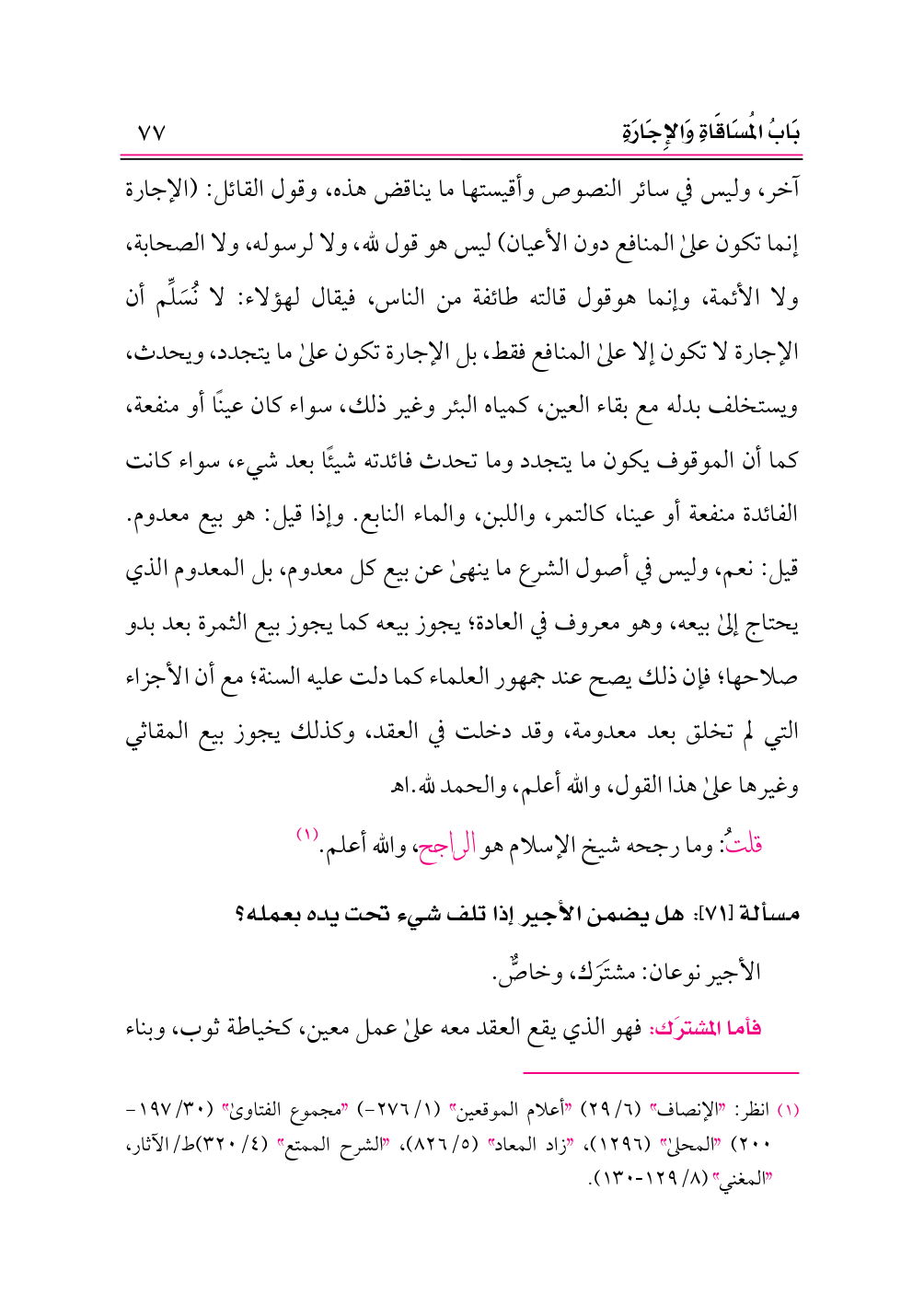 آخر، وليس في سائر النصوص وأقيستها ما يناقض هذه، وقول القائل: (الإجارة إنما تكون على المنافع دون الأعيان) ليس هو قول لله، ولا لرسوله، ولا الصحابة، ولا الأئمة، وإنما هوقول قالته طائفة من الناس، فيقال لهؤلاء: لا نُسَلِّم أن الإجارة لا تكون إلا على المنافع فقط، بل الإجارة تكون على ما يتجدد، ويحدث، ويستخلف بدله مع بقاء العين، كمياه البئر وغير ذلك، سواء كان عينًا أو منفعة، كما أن الموقوف يكون ما يتجدد وما تحدث فائدته شيئًا بعد شيء، سواء كانت الفائدة منفعة أو عينا، كالتمر، واللبن، والماء النابع. وإذا قيل: هو بيع معدوم. قيل: نعم، وليس في أصول الشرع ما ينهى عن بيع كل معدوم، بل المعدوم الذي يحتاج إلى بيعه، وهو معروف في العادة؛ يجوز بيعه كما يجوز بيع الثمرة بعد بدو صلاحها؛ فإن ذلك يصح عند جمهور العلماء كما دلت عليه السنة؛ مع أن الأجزاء التي لم تخلق بعد معدومة، وقد دخلت في العقد، وكذلك يجوز بيع المقاثي وغيرها على هذا القول، والله أعلم، والحمد لله. اهـ