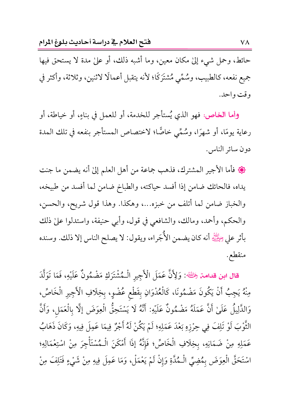 قال ابن قدامة -رحمه الله-: وَلِأَنَّ عَمَلَ الْأَجِيرِ الْمُشْتَرَكِ مَضْمُونٌ عَلَيْهِ، فَمَا تَوَلَّدَ مِنْهُ يَجِبُ أَنْ يَكُونَ مَضْمُونًا، كَالْعُدْوَانِ بِقَطْعِ عُضْوٍ، بِخِلَافِ الْأَجِيرِ الْخَاصِّ، وَالدَّلِيلُ عَلَى أَنَّ عَمَلَهُ مَضْمُونٌ عَلَيْهِ: أَنَّهُ لَا يَسْتَحِقُّ الْعِوَضَ إلَّا بِالْعَمَلِ، وَأَنَّ الثَّوْبَ لَوْ تَلِفَ فِي حِرْزِهِ بَعْدَ عَمَلِهِ؛ لَمْ يَكُنْ لَهُ أَجْرٌ فِيمَا عَمِلَ فِيهِ، وَكَانَ ذَهَابُ عَمَلِهِ مِنْ ضَمَانِهِ، بِخِلَافِ الْخَاصِّ؛ فَإِنَّهُ إذَا أَمْكَنَ الْمُسْتَأْجِرَ مِنْ اسْتِعْمَالِهِ؛ اسْتَحَقَّ الْعِوَضَ بِمُضِيِّ الْمُدَّةِ وَإِنْ لَمْ يَعْمَلْ، وَمَا عَمِلَ فِيهِ مِنْ شَيْءٍ فَتَلِفَ مِنْ