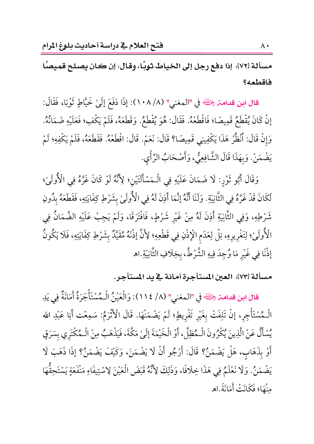 قال ابن قدامة -رحمه الله- في «المغني» (٨/ ١٠٨): إذَا دَفَعَ إلَى خَيَّاطٍ ثَوْبًا، فَقَالَ: إنْ كَانَ يُقْطَعُ قَمِيصًا؛ فَاقْطَعْهُ. فَقَالَ: هُوَ يُقْطَعُ. وَقَطَعَهُ، فَلَمْ يَكْفِ؛ فَعَلَيْهِ ضَمَانُهُ. وَإِنْ قَالَ: اُنْظُرْ هَذَا يَكْفِينِي قَمِيصًا؟ قَالَ: نَعَمْ. قَالَ: اقْطَعْهُ. فَقَطَعَهُ، فَلَمْ يَكْفِهِ؛ لَمْ يَضْمَنْ. وَبِهَذَا قَالَ الشَّافِعِيُّ، وَأَصْحَابُ الرَّأْيِ.