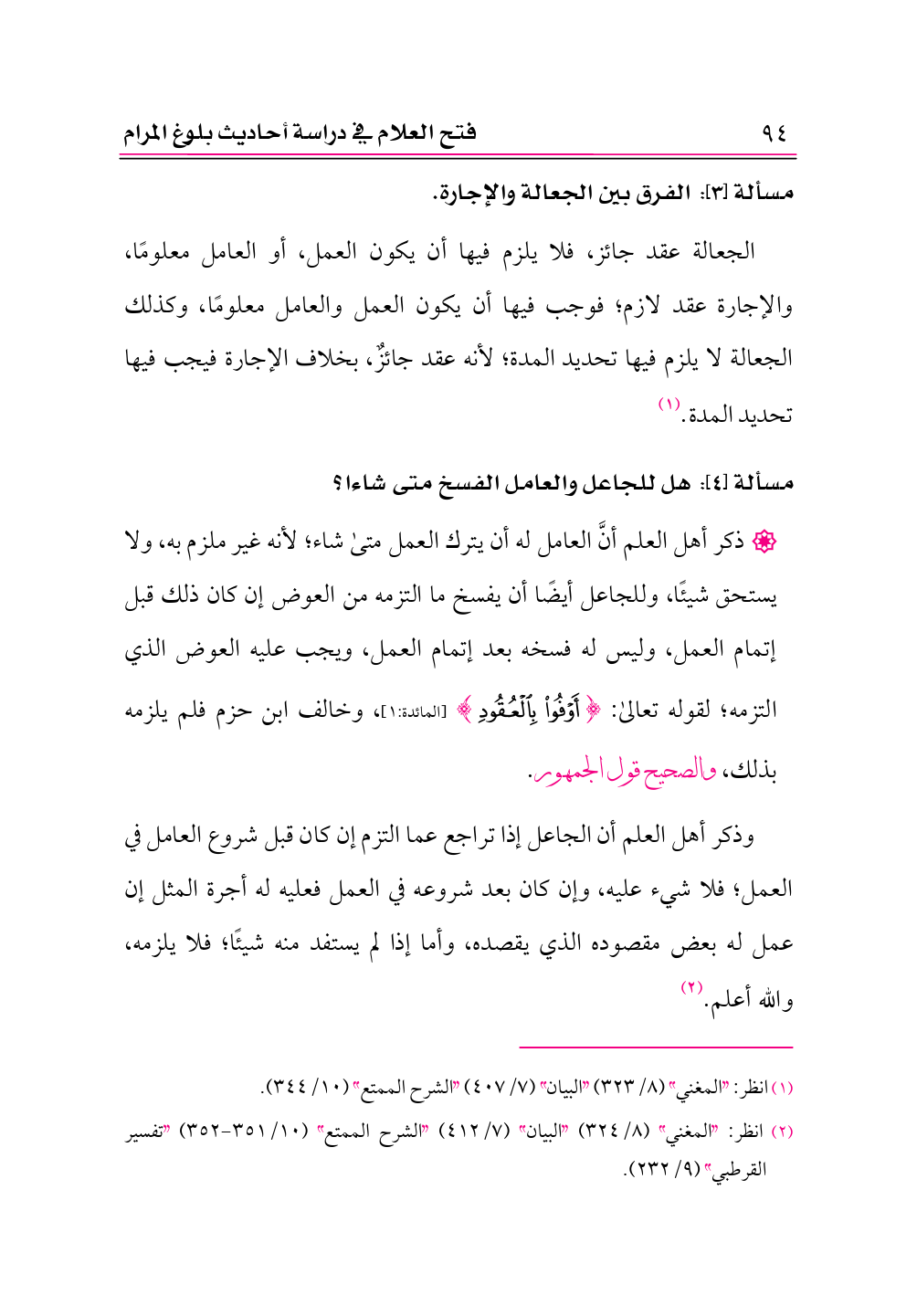 • ذكر أهل العلم أنَّ العامل له أن يترك العمل متى شاء؛ لأنه غير ملزم به، ولا يستحق شيئًا، وللجاعل أيضًا أن يفسخ ما التزمه من العوض إن كان ذلك قبل إتمام العمل، وليس له فسخه بعد إتمام العمل، ويجب عليه العوض الذي التزمه؛ لقوله تعالى: {أَوْفُوا بِالْعُقُودِ} [المائدة:١]، وخالف ابن حزم فلم يلزمه بذلك، والصحيح قول الجمهور.