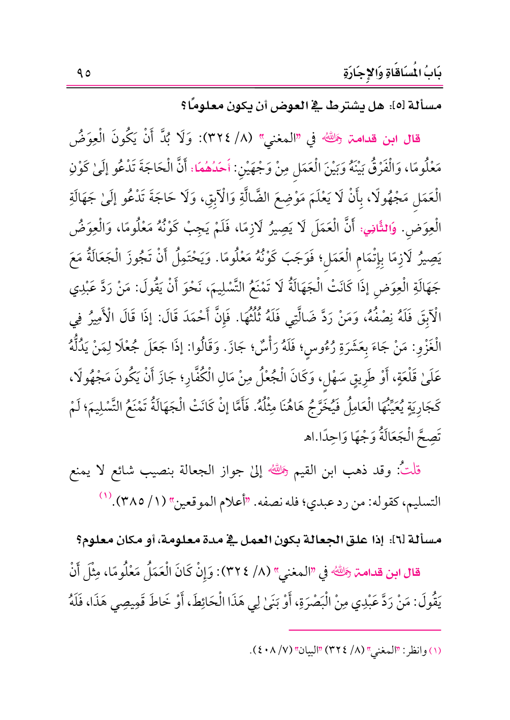 قلتُ: وقد ذهب ابن القيم -رحمه الله- إلى جواز الجعالة بنصيب شائع لا يمنع التسليم، كقوله: من رد عبدي؛ فله نصفه. «أعلام الموقعين» (١/ ٣٨٥). (¬١)