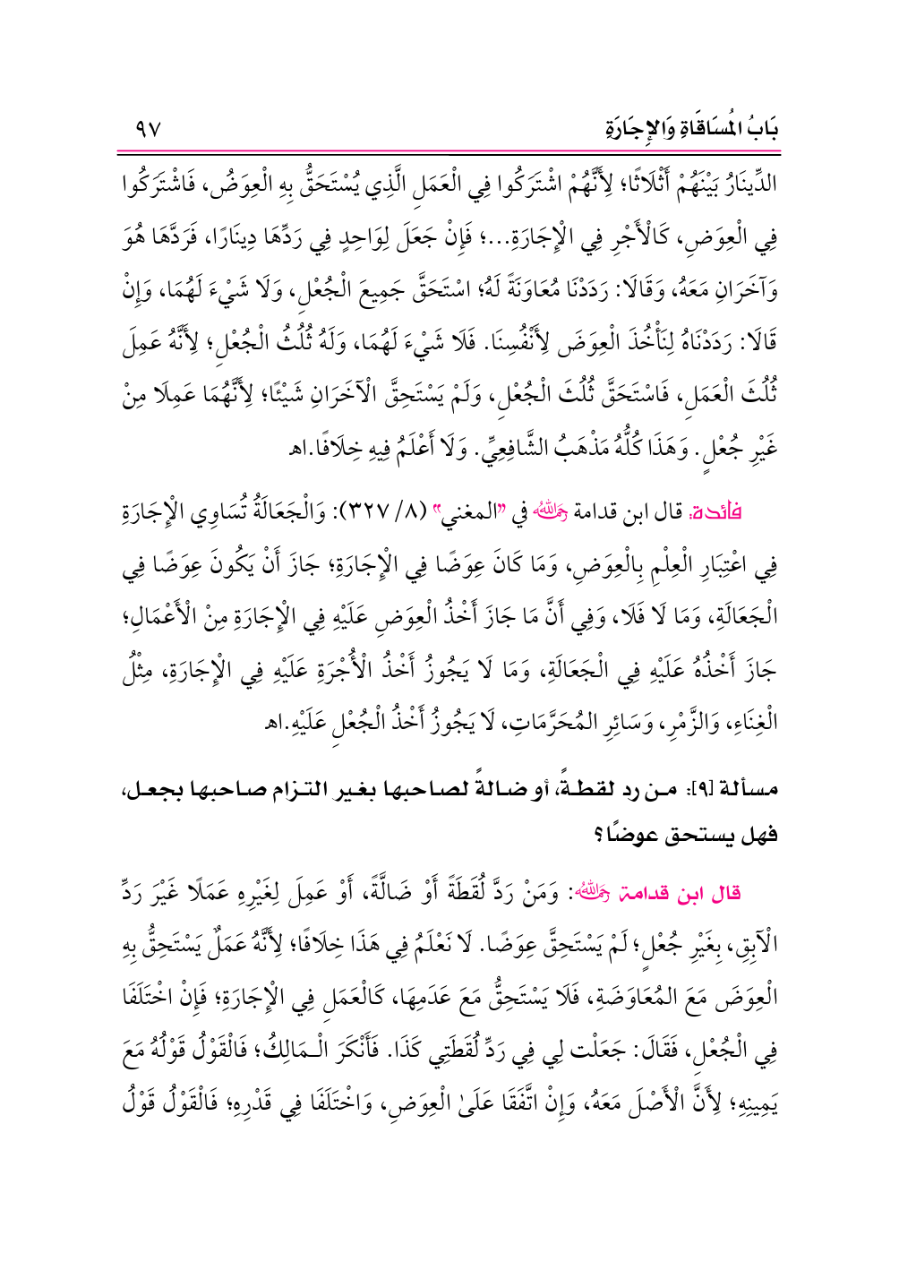 فائدة: قال ابن قدامة -رحمه الله- في «المغني» (٨/ ٣٢٧): وَالْجَعَالَةُ تُسَاوِي الْإِجَارَةِ فِي اعْتِبَارِ الْعِلْمِ بِالْعِوَضِ، وَمَا كَانَ عِوَضًا فِي الْإِجَارَةِ؛ جَازَ أَنْ يَكُونَ عِوَضًا فِي الْجَعَالَةِ، وَمَا لَا فَلَا، وَفِي أَنَّ مَا جَازَ أَخْذُ الْعِوَضِ عَلَيْهِ فِي الْإِجَارَةِ مِنْ الْأَعْمَالِ؛ جَازَ أَخْذُهُ عَلَيْهِ فِي الْجَعَالَةِ، وَمَا لَا يَجُوزُ أَخْذُ الْأُجْرَةِ عَلَيْهِ فِي الْإِجَارَةِ، مِثْلُ الْغِنَاءِ، وَالزَّمْرِ، وَسَائِرِ المُحَرَّمَاتِ، لَا يَجُوزُ أَخْذُ الْجُعْلِ عَلَيْهِ. اهـ