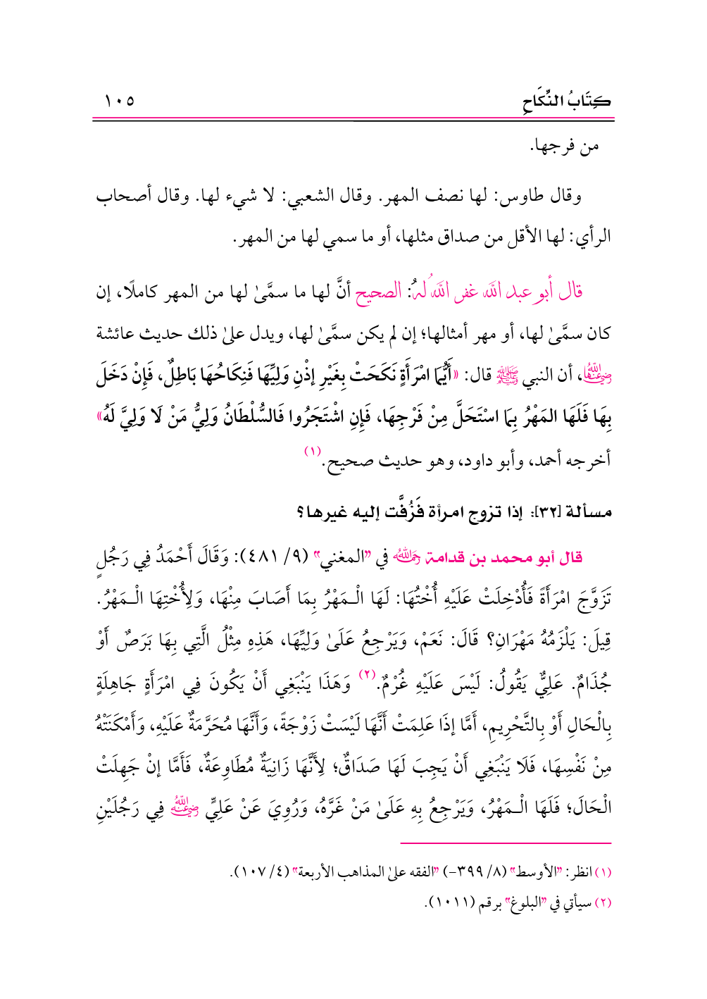 قال أبو عبد الله غفر اللهُ لهُ: الصحيح أنَّ لها ما سمَّى لها من المهر كاملًا، إن كان سمَّى لها، أو مهر أمثالها؛ إن لم يكن سمَّى لها، ويدل على ذلك حديث عائشة -رضي الله عنها-، أن النبي - صلى الله عليه وسلم - قال: «أَيُّمَا امْرَأَةٍ نَكَحَتْ بِغَيْرِ إذْنِ وَلِيِّهَا فَنِكَاحُهَا بَاطِلٌ، فَإِنْ دَخَلَ بِهَا فَلَهَا المَهْرُ بِمَا اسْتَحَلَّ مِنْ فَرْجِهَا، فَإِنِ اشْتَجَرُوا فَالسُّلْطَانُ وَلِيُّ مَنْ لَا وَلِيَّ لَهُ» أخرجه أحمد، وأبو داود، وهو حديث صحيح. (¬١)