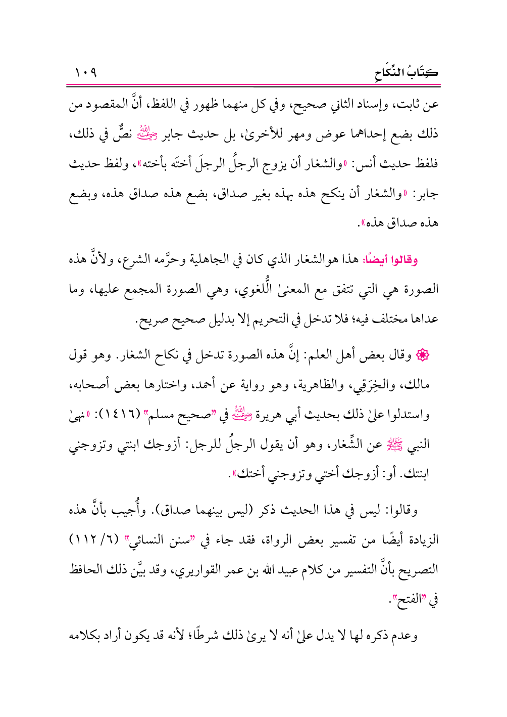 وقالوا أيضًا: هذا هوالشغار الذي كان في الجاهلية وحرَّمه الشرع، ولأنَّ هذه الصورة هي التي تتفق مع المعنى الُّلغوي، وهي الصورة المجمع عليها، وما عداها مختلف فيه؛ فلا تدخل في التحريم إلا بدليل صحيح صريح.