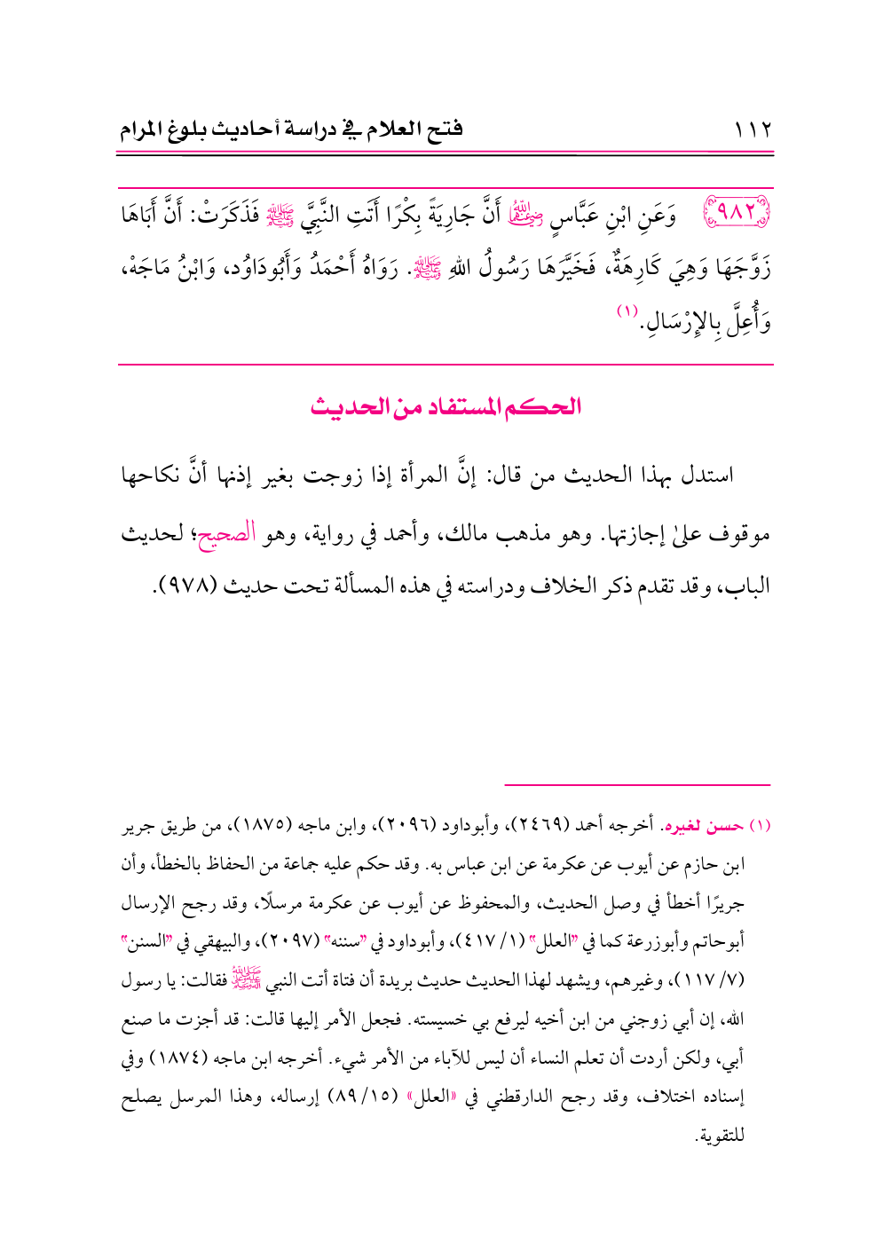٩٨٢ - وَعَنِ ابْنِ عَبَّاسٍ -رضي الله عنهما- أَنَّ جَارِيَةً بِكْرًا أَتَتِ النَّبِيَّ - صلى الله عليه وسلم - فَذَكَرَتْ: أَنَّ أَبَاهَا زَوَّجَهَا وَهِيَ كَارِهَةٌ، فَخَيَّرَهَا رَسُولُ اللهِ - صلى الله عليه وسلم -. رَوَاهُ أَحْمَدُ وَأَبُودَاوُد، وَابْنُ مَاجَهْ، وَأُعِلَّ بِالإِرْسَالِ. (¬١)