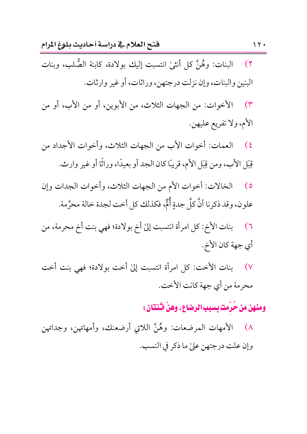 ٦) بنات الأخ: كل امرأة انتسبت إلى أخ بولادة؛ فهي بنت أخ محرمة، من أي جهة كان الأخ.