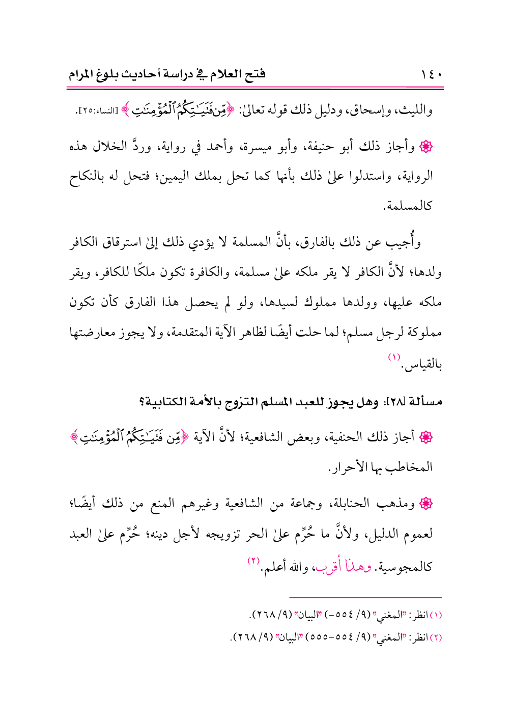 • ومذهب الحنابلة، وجماعة من الشافعية وغيرهم المنع من ذلك أيضًا؛ لعموم الدليل، ولأنَّ ما حُرِّم على الحر تزويجه لأجل دينه؛ حُرِّم على العبد كالمجوسية. وهذا أقرب، والله أعلم. (¬٢)