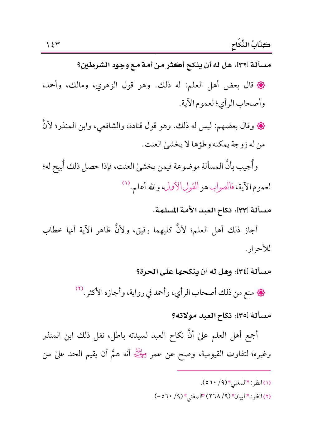 وأُجيب بأنَّ المسألة موضوعة فيمن يخشى العنت، فإذا حصل ذلك أُبيح له؛ لعموم الآية، فالصواب هو القول الأول، والله أعلم. (¬١)