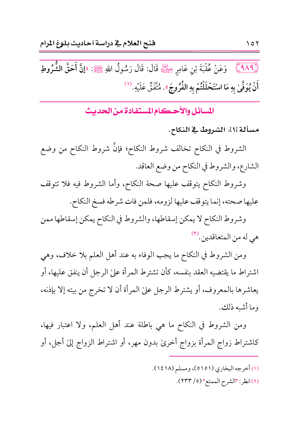 ٩٨٩ - وَعَنْ عُقْبَةَ بْنِ عَامِرٍ -رضي الله عنه- قَالَ: قَالَ رَسُولُ اللهِ - صلى الله عليه وسلم -: «إنَّ أَحَقَّ الشُّرُوطِ أَنْ يُوَفَّى بِهِ مَا اسْتَحْلَلْتُمْ بِهِ الفُرُوجَ». مُتَّفَقٌ عَلَيْهِ. (¬١)