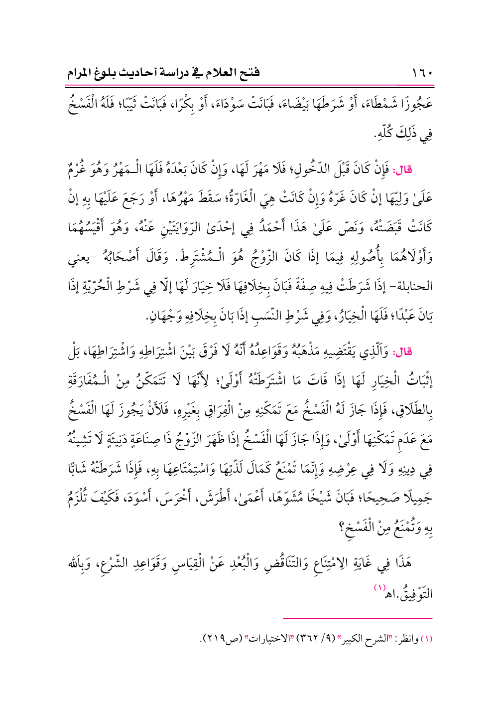 قال: وَاَلّذِي يَقْتَضِيهِ مَذْهَبُهُ وَقَوَاعِدُهُ أَنّهُ لَا فَرْقَ بَيْنَ اشْتِرَاطِهِ وَاشْتِرَاطِهَا، بَلْ إثْبَاتُ الْخِيَارِ لَهَا إذَا فَاتَ مَا اشْتَرَطَتْهُ أَوْلَى؛ لِأَنّهَا لَا تَتَمَكّنُ مِنْ الْمُفَارَقَةِ بِالطّلَاقِ، فَإِذَا جَازَ لَهُ الْفَسْخُ مَعَ تَمَكّنِهِ مِنْ الْفِرَاقِ بِغَيْرِهِ، فَلَأَنْ يَجُوزَ لَهَا الْفَسْخُ مَعَ عَدَمِ تَمَكّنِهَا أَوْلَى، وَإِذَا جَازَ لَهَا الْفَسْخُ إذَا ظَهَرَ الزّوْجُ ذَا صِنَاعَةٍ دَنِيئَةٍ لَا تَشِينُهُ فِي دِينِهِ وَلَا فِي عِرْضِهِ وَإِنّمَا تَمْنَعُ كَمَالَ لَذّتِهَا وَاسْتِمْتَاعِهَا بِهِ، فَإِذَا شَرَطَتْهُ شَابًّا جَمِيلًا صَحِيحًا؛ فَبَانَ شَيْخًا مُشَوّهًا، أَعْمَى، أَطْرَشَ، أَخْرَسَ، أَسْوَدَ، فَكَيْفَ تُلْزَمُ بِهِ وَتُمْنَعُ مِنْ الْفَسْخِ؟