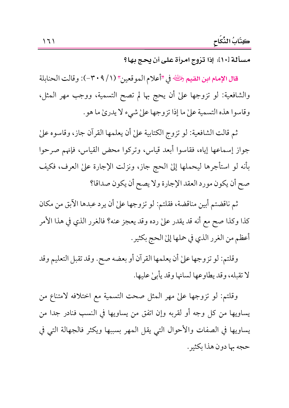 قال الإمام ابن القيم -رحمه الله- في «أعلام الموقعين» (١/ ٣٠٩ - ): وقالت الحنابلة والشافعية: لو تزوجها على أن يحج بها لم تصح التسمية، ووجب مهر المثل، وقاسوا هذه التسمية على ما إذا تزوجها على شيء لا يدرى ما هو.