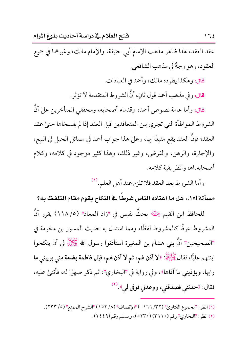 للحافظ ابن القيم -رحمه الله- بحثٌ نفيس في «زاد المعاد» (٥/ ١١٨) يقرر أنَّ المشروط عرفًا كالمشروط لفظًا، ومما استدل به حديث المسور بن مخرمة في «الصحيحين» أنَّ بني هشام بن المغيرة استأذنوا رسول الله -صلى الله عليه وعلى آله وسلم- في أن ينكحوا ابنتهم عليًّا، فقال -صلى الله عليه وعلى آله وسلم-: «لا آذن لهم، ثم لا آذن لهم، فإنما فاطمة بضعة مني يريبني ما رابها، ويؤذيني ما آذاها»، وفي رواية في «البخاري»: ثم ذكر صهرًا له، فأثنى عليه، فقال: «حدثني فصدقني، ووعدني فوفى لي». (¬٢)