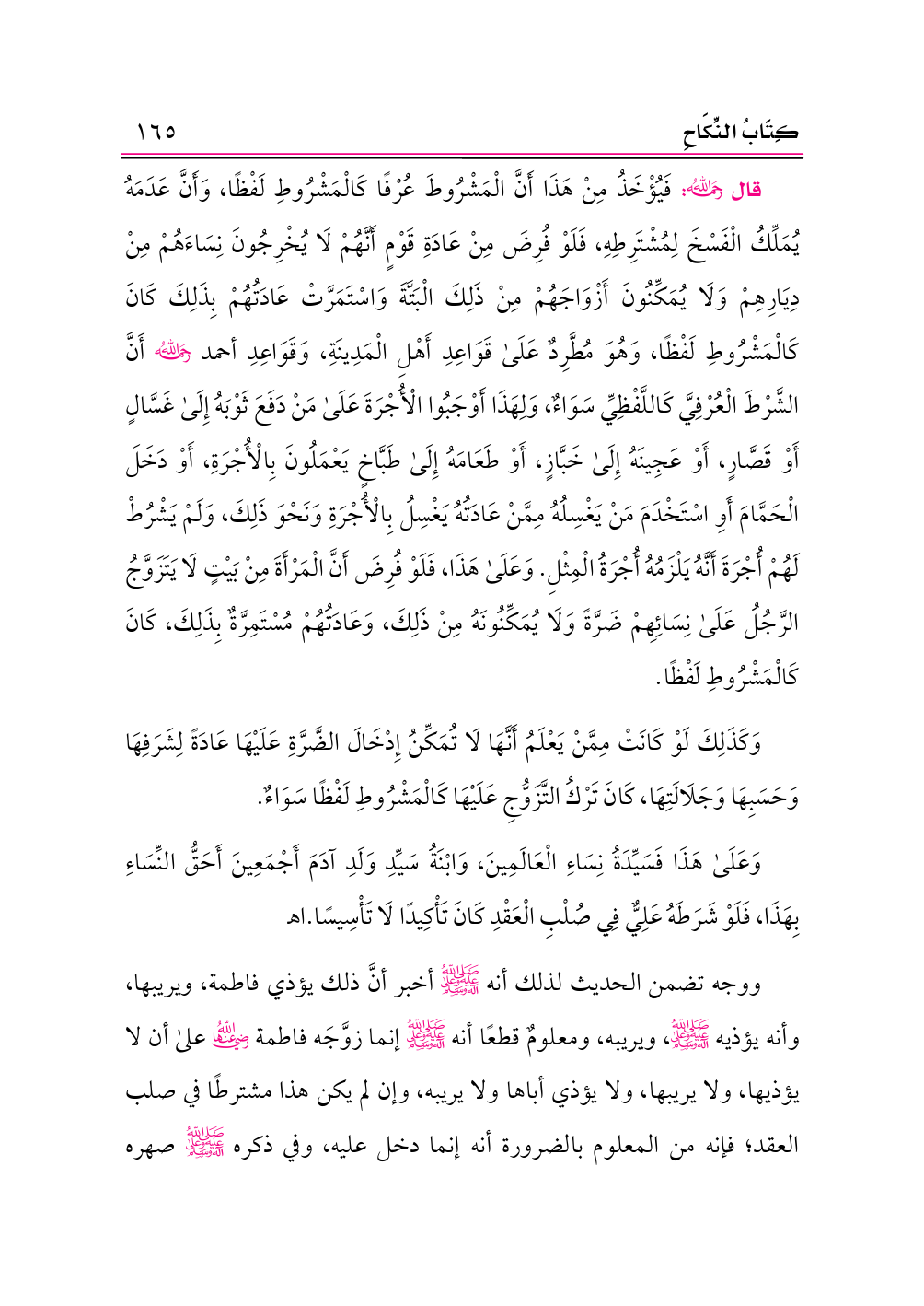 قال -رحمه الله-: فَيُؤْخَذُ مِنْ هَذَا أَنَّ الْمَشْرُوطَ عُرْفًا كَالْمَشْرُوطِ لَفْظًا، وَأَنَّ عَدَمَهُ يُمَلِّكُ الْفَسْخَ لِمُشْتَرِطِهِ، فَلَوْ فُرِضَ مِنْ عَادَةِ قَوْمٍ أَنَّهُمْ لَا يُخْرِجُونَ نِسَاءَهُمْ مِنْ دِيَارِهِمْ وَلَا يُمَكِّنُونَ أَزْوَاجَهُمْ مِنْ ذَلِكَ الْبَتَّةَ وَاسْتَمَرَّتْ عَادَتُهُمْ بِذَلِكَ كَانَ كَالْمَشْرُوطِ لَفْظًا، وَهُوَ مُطَّرِدٌ عَلَى قَوَاعِدِ أَهْلِ الْمَدِينَةِ، وَقَوَاعِدِ أحمد -رحمه الله- أَنَّ الشَّرْطَ الْعُرْفِيَّ كَاللَّفْظِيِّ سَوَاءٌ، وَلِهَذَا أَوْجَبُوا الْأُجْرَةَ عَلَى مَنْ دَفَعَ ثَوْبَهُ إِلَى غَسَّالٍ أَوْ قَصَّارٍ، أَوْ عَجِينَهُ إِلَى خَبَّازٍ، أَوْ طَعَامَهُ إِلَى طَبَّاخٍ يَعْمَلُونَ بِالْأُجْرَةِ، أَوْ دَخَلَ الْحَمَّامَ أَوِ اسْتَخْدَمَ مَنْ يَغْسِلُهُ مِمَّنْ عَادَتُهُ يَغْسِلُ بِالْأُجْرَةِ وَنَحْوَ ذَلِكَ، وَلَمْ يَشْرُطْ لَهُمْ أُجْرَةَ أَنَّهُ يَلْزَمُهُ أُجْرَةُ الْمِثْلِ. وَعَلَى هَذَا، فَلَوْ فُرِضَ أَنَّ الْمَرْأَةَ مِنْ بَيْتٍ لَا يَتَزَوَّجُ الرَّجُلُ عَلَى نِسَائِهِمْ ضَرَّةً وَلَا يُمَكِّنُونَهُ مِنْ ذَلِكَ، وَعَادَتُهُمْ مُسْتَمِرَّةٌ بِذَلِكَ، كَانَ كَالْمَشْرُوطِ لَفْظًا.