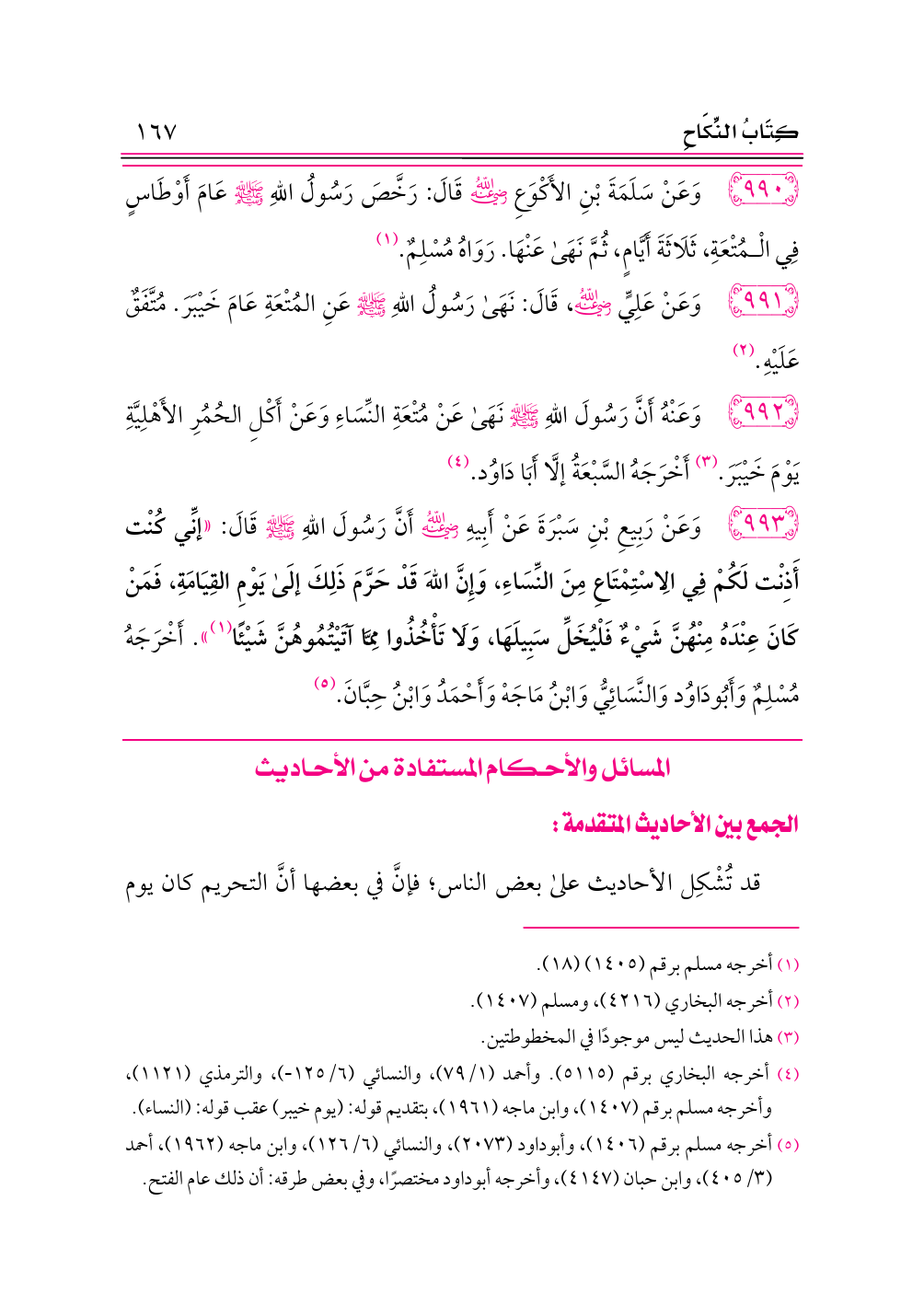 (¬٤) أخرجه البخاري برقم (٥١١٥). وأحمد (١/ ٧٩)، والنسائي (٦/ ١٢٥)، والترمذي (١١٢١)، وأخرجه مسلم برقم (١٤٠٧)، وابن ماجه (١٩٦١)، بتقديم قوله: (يوم خيبر) عقب قوله: (النساء).