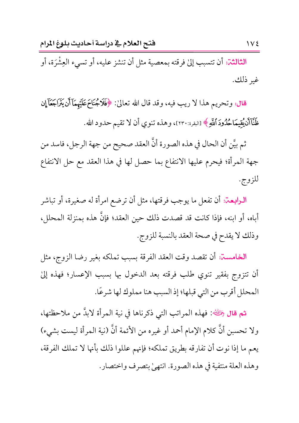 قال: وتحريم هذا لا ريب فيه، وقد قال الله تعالى: {فَلَا جُنَاحَ عَلَيْهِمَا أَنْ يَتَرَاجَعَا إِنْ ظَنَّا أَنْ يُقِيمَا حُدُودَ اللَّهِ} [البقرة:٢٣٠]، وهذه تنوي أن لا تقيم حدود الله.