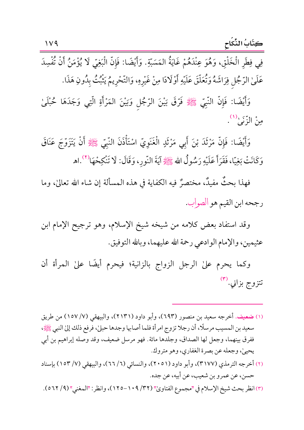 وَأَيْضًا: فَإِنّ مَرْثَدَ بْنَ أَبِي مَرْثَدٍ الْغَنَوِيّ اسْتَأْذَنَ النّبِيّ - صلى الله عليه وسلم - أَنْ يَتَزَوّجَ عَنَاقَ وَكَانَتْ بَغِيّا، فَقَرَأَ عَلَيْهِ رَسُولُ الله - صلى الله عليه وسلم - آيَةَ النّورِ، وَقَالَ: لَا تَنْكِحْهَا (¬٢). اهـ