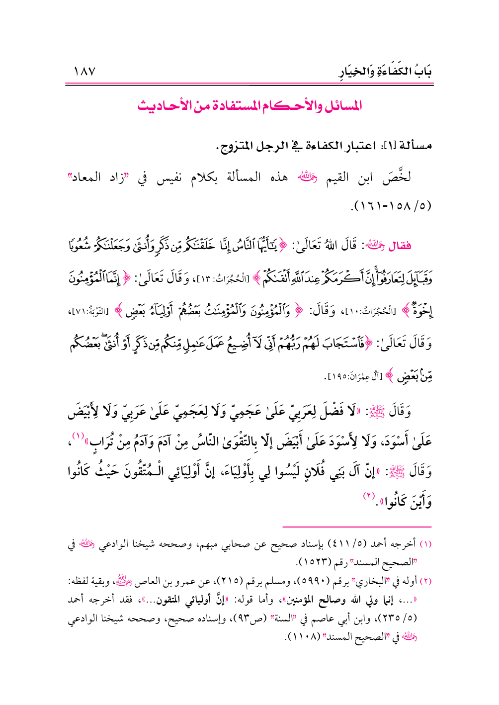 فقال -رحمه الله-: قَالَ اللهُ تَعَالَى: {يَاأَيُّهَا النَّاسُ إِنَّا خَلَقْنَاكُمْ مِنْ ذَكَرٍ وَأُنْثَى وَجَعَلْنَاكُمْ شُعُوبًا وَقَبَائِلَ لِتَعَارَفُوا إِنَّ أَكْرَمَكُمْ عِنْدَ اللَّهِ أَتْقَاكُمْ} [الْحُجُرَاتُ: ١٣]، وَقَالَ تَعَالَى: {إِنَّمَا الْمُؤْمِنُونَ إِخْوَةٌ} [الْحُجُرَاتُ:١٠]، وَقَالَ: {وَالْمُؤْمِنُونَ وَالْمُؤْمِنَاتُ بَعْضُهُمْ أَوْلِيَاءُ بَعْضٍ} [التّوْبَةُ:٧١]، وَقَالَ تَعَالَى: {فَاسْتَجَابَ لَهُمْ رَبُّهُمْ أَنِّي لَا أُضِيعُ عَمَلَ عَامِلٍ مِنْكُمْ مِنْ ذَكَرٍ أَوْ أُنْثَى بَعْضُكُمْ مِنْ بَعْضٍ} [آلُ عِمْرَانَ:١٩٥].