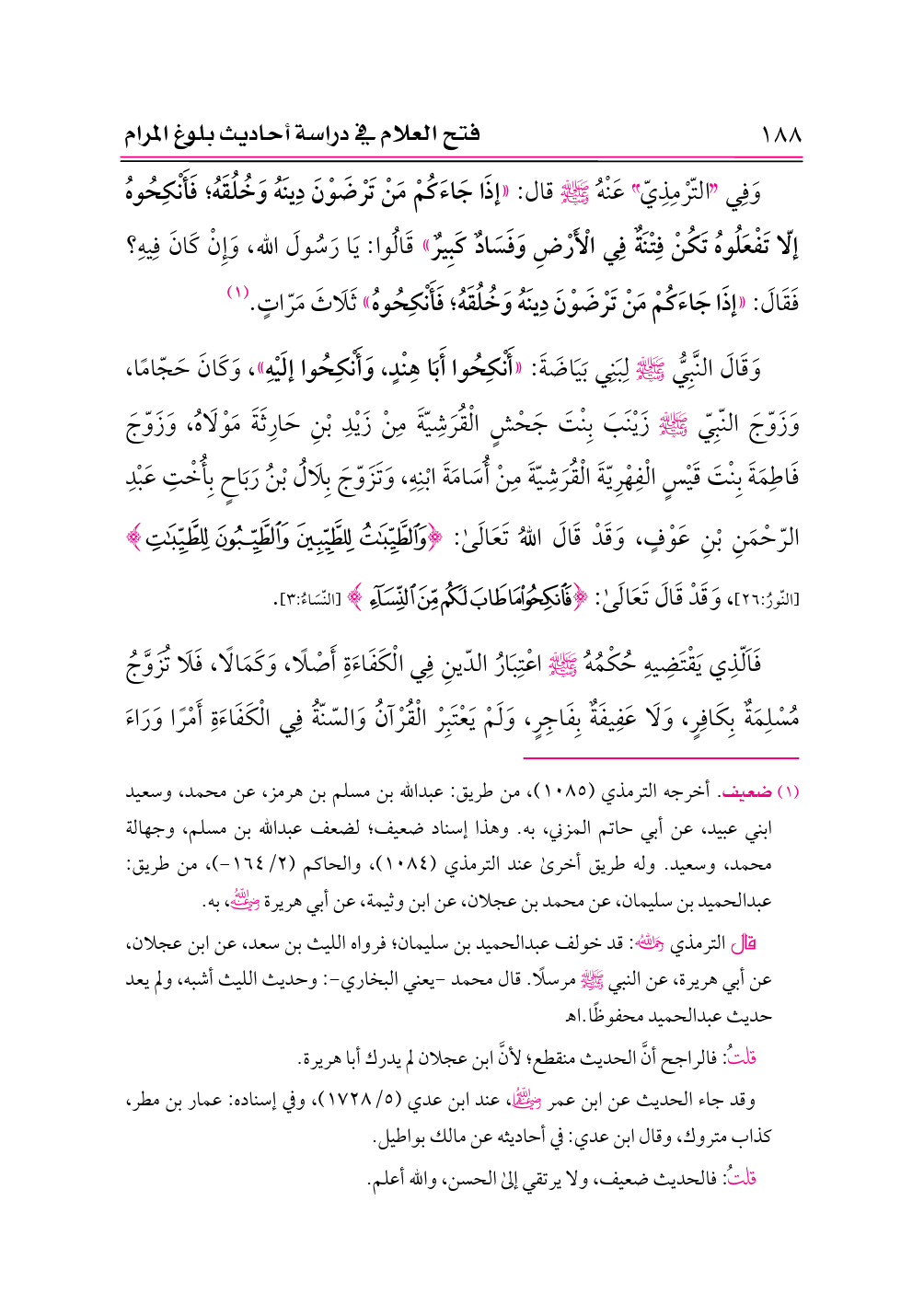 وَفِي «التّرْمِذِيّ» عَنْهُ - صلى الله عليه وسلم - قال: «إذَا جَاءَكُمْ مَنْ تَرْضَوْنَ دِينَهُ وَخُلُقَهُ؛ فَأَنْكِحُوهُ إلّا تَفْعَلُوهُ تَكُنْ فِتْنَةٌ فِي الْأَرْضِ وَفَسَادٌ كَبِيرٌ» قَالُوا: يَا رَسُولَ الله، وَإِنْ كَانَ فِيهِ؟ فَقَالَ: «إذَا جَاءَكُمْ مَنْ تَرْضَوْنَ دِينَهُ وَخُلُقَهُ؛ فَأَنْكِحُوهُ» ثَلَاثَ مَرّاتٍ. (¬١)