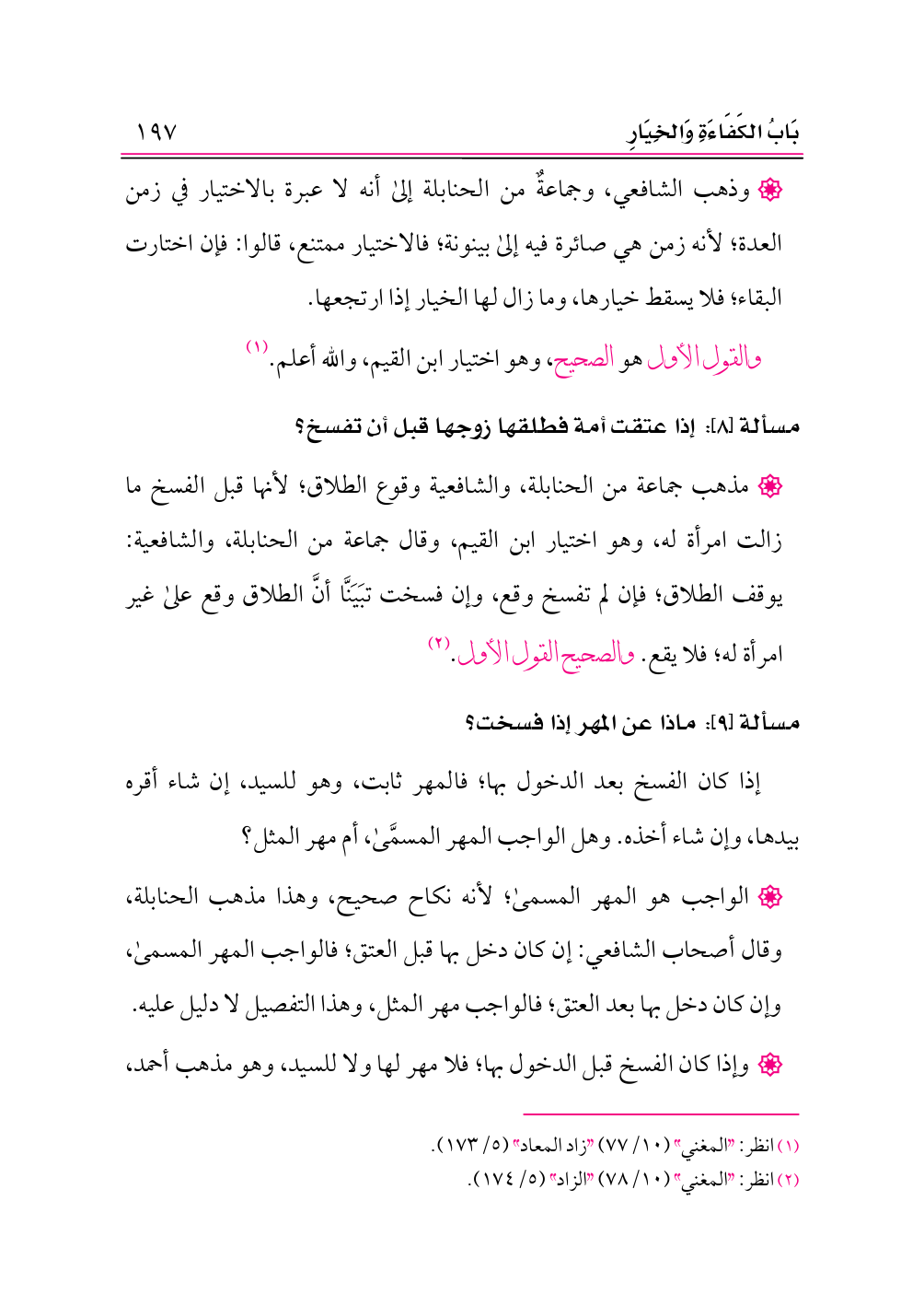 • مذهب جماعة من الحنابلة، والشافعية وقوع الطلاق؛ لأنها قبل الفسخ ما زالت امرأة له، وهو اختيار ابن القيم، وقال جماعة من الحنابلة، والشافعية: يوقف الطلاق؛ فإن لم تفسخ وقع، وإن فسخت تبَيَنَّا أنَّ الطلاق وقع على غير امرأة له؛ فلا يقع. والصحيح القول الأول. (¬٢)