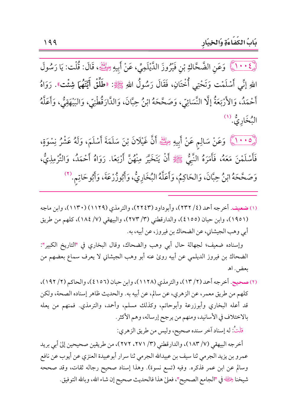 ١٠٠٤ - وَعَنِ الضَّحَّاكِ بْنِ فَيْرُوزَ الدَّيْلَمِيِّ، عَنْ أَبِيهِ -رضي الله عنه-، قَالَ: قُلْت: يَا رَسُولَ اللهِ إنِّي أَسْلَمْت وَتَحْتِي أُخْتَانِ، فَقَالَ رَسُولُ اللهِ - صلى الله عليه وسلم -: «طَلِّقْ أَيَّتَهُمَا شِئْت». رَوَاهُ أَحْمَدُ، وَالأَرْبَعَةُ إلَّا النَّسَائِيّ، وَصَحَّحَهُ ابْنُ حِبَّانَ، وَالدَّارَقُطْنِيّ، وَالبَيْهَقِيُّ، وَأَعَلَّهُ البُخَارِيُّ. (¬١)