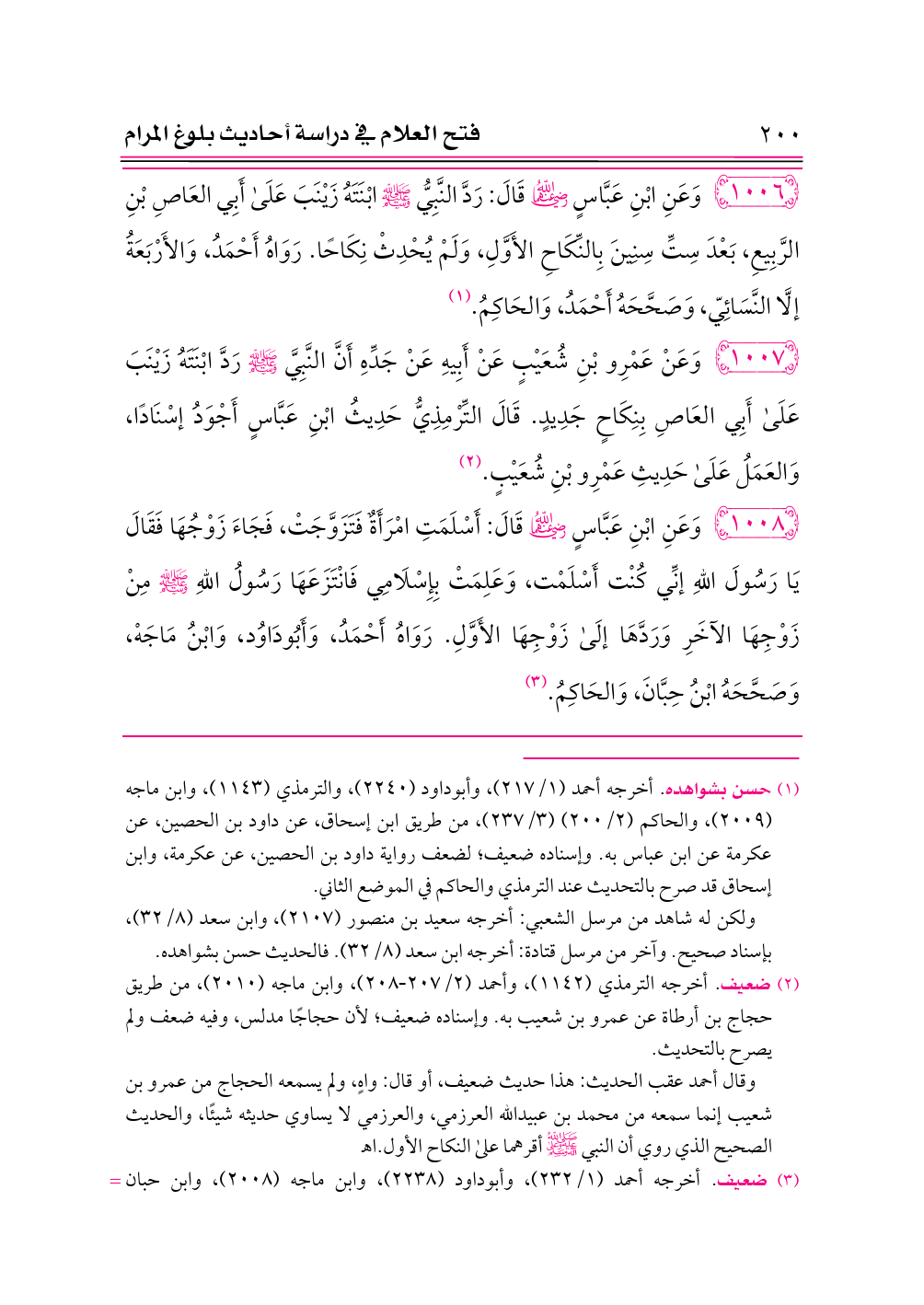 ١٠٠٦ - وَعَنِ ابْنِ عَبَّاسٍ -رضي الله عنهما- قَالَ: رَدَّ النَّبِيُّ - صلى الله عليه وسلم - ابْنَتَهُ زَيْنَبَ عَلَى أَبِي العَاصِ بْنِ الرَّبِيعِ، بَعْدَ سِتِّ سِنِينَ بِالنِّكَاحِ الأَوَّلِ، وَلَمْ يُحْدِثْ نِكَاحًا. رَوَاهُ أَحْمَدُ، وَالأَرْبَعَةُ إلَّا النَّسَائِيّ، وَصَحَّحَهُ أَحْمَدُ، وَالحَاكِمُ. (¬١)